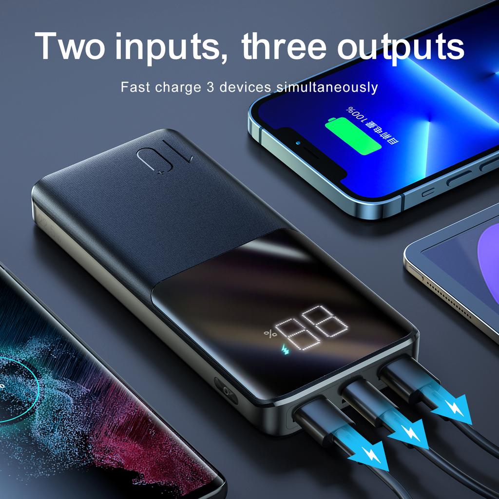 Med én USB-C-port og to USB-A-porte kan du oplade op til tre enheder på én gang. Perfekt når både mobilen, høretelefonerne og måske en vens enhed har brug for ny energi. Hurtigopladning op til 22.5W sørger for, at du hurtigt er tilbage i gang, og det tydelige LED-display viser præcist, hvor meget batteri du har tilbage.