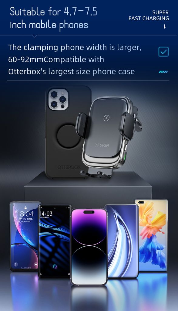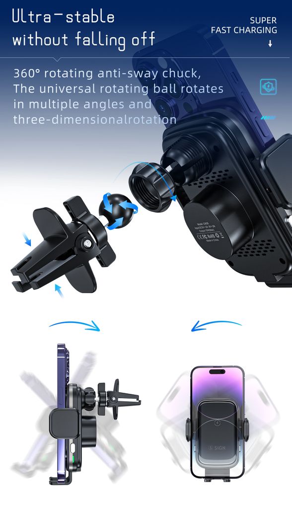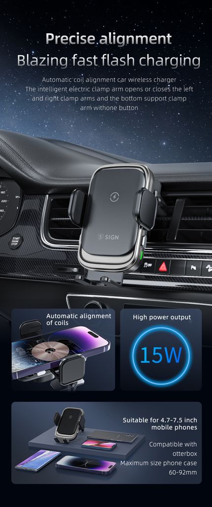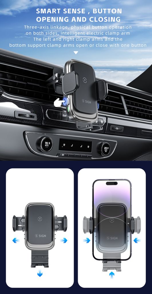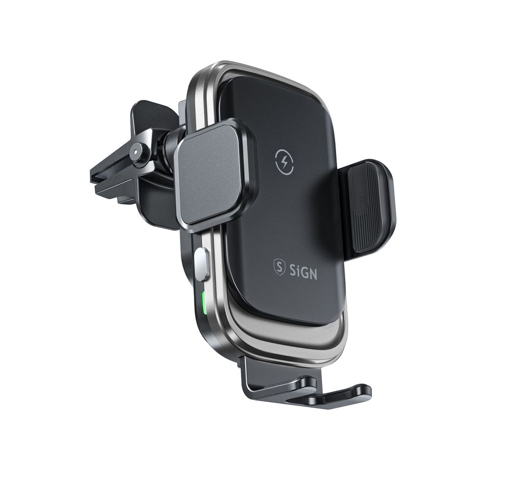 Giv mobilen en VIP-plads i bilen. SiGN mobilholder til bil med trådløs opladning gør køreturen både smartere og mere praktisk. Sæt telefonen i holderen og Qi-opladningen starter automatisk, så batteriet fyldes op mens du kører. De smarte touchsensorer åbner og lukker automatisk klemmerne når du trykker, så du nemt kan placere eller tage mobilen ud med én hånd. Holderen monteres hurtigt i bilens ventilationsgitter og giver en stabil placering med godt overblik over skærmen under kørslen. Den kompakte konstruktion i aluminiumslegering og glas giver et stilrent udseende og solid kvalitet. Perfekt når du vil kombinere mobilholder og trådløs opladning i bilen.