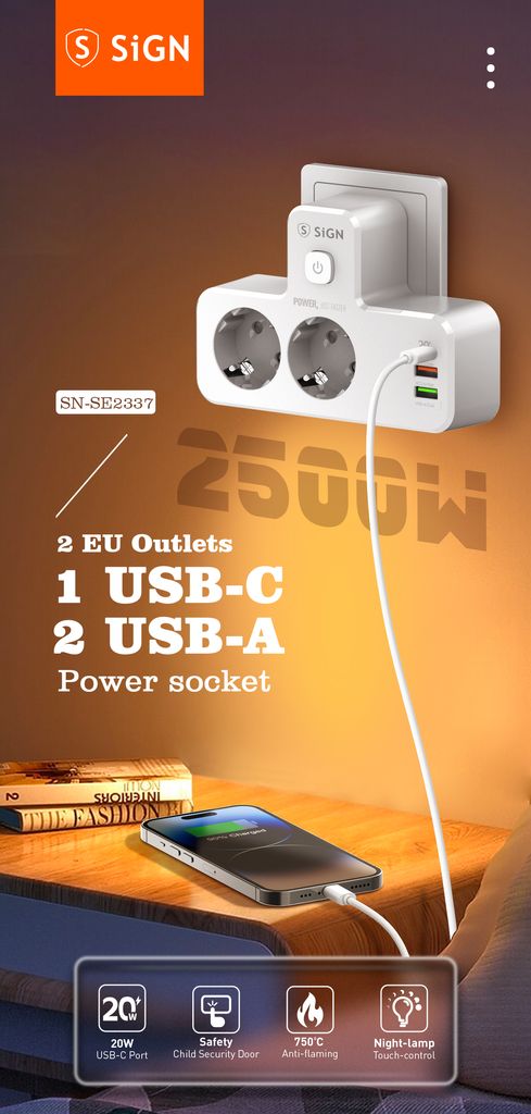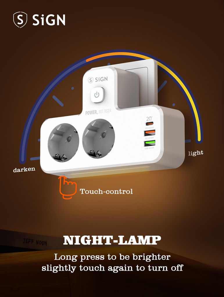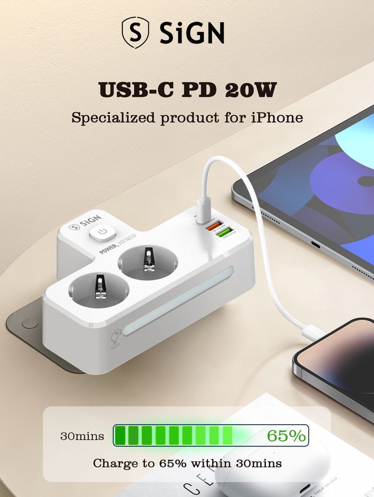 Mere kraft og mindre kabelrod. SiGN 20W stikdåse med LED-natlampe er den smarte løsning, der klarer både strøm og opladning i et stilrent design. Med to AC-udtag, to USB-A og én USB-C kan du oplade flere enheder samtidig uden kamp om stikkene. Perfekt til mobil, tablet og andre USB-enheder, der trænger til ny energi. Den indbyggede LED-natlampe giver et blødt og behageligt lys, som passer perfekt ved sengen eller i gangen. Med støtte for Power Delivery og Quick Charge får du op til 20W hurtigopladning via USB-C. Kompakt, praktisk og klar til at gøre hverdagen lidt lettere.