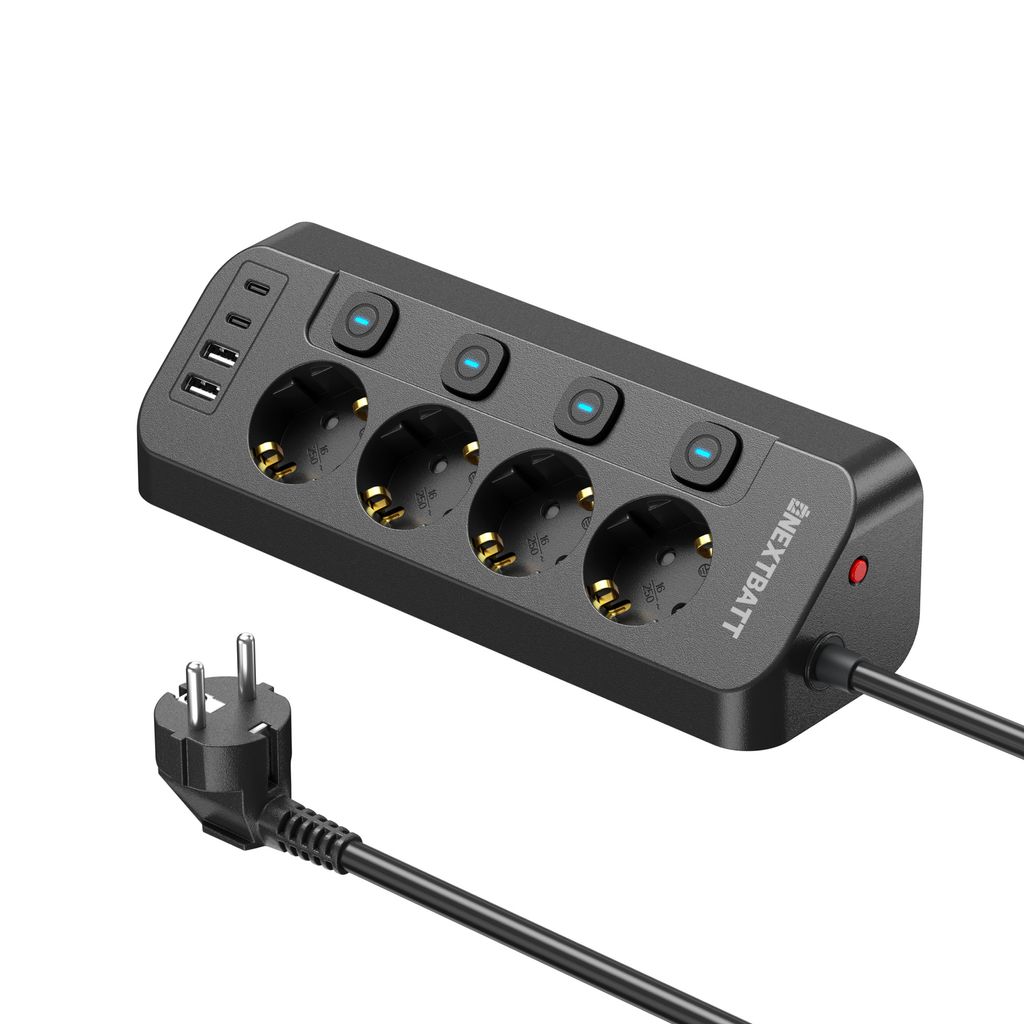Giv dine stikkontakter en smart opgradering med NEXTBATTs stikdåse, der gør opladning både nemmere og sjovere i hverdagen. Med fire AC-udtag og fire USB-porte, 2x USB-C og 2x USB-A, kan du samle al opladning ét sted uden besvær. Perfekt til hjemmet eller kontoret, hvor flere enheder har brug for strøm samtidig. Det lange kabel på 1,8 meter giver fleksibel placering præcis dér, hvor du har brug for det. Den robuste konstruktion klarer også mere krævende enheder uden problemer. Det smarte trekantede design med 90 graders vinkel gør, at den passer perfekt i hjørner, langs vægge eller under bordkanter for en ryddelig og stilren løsning.