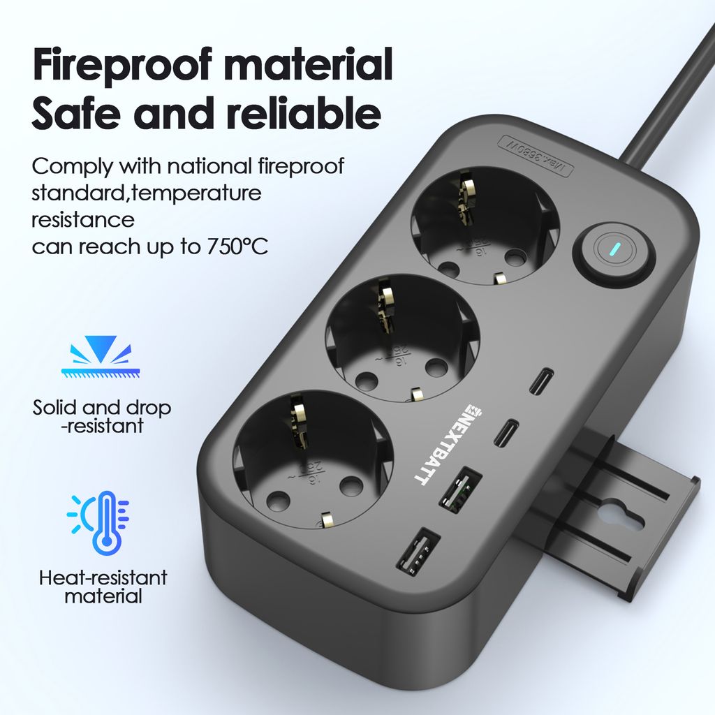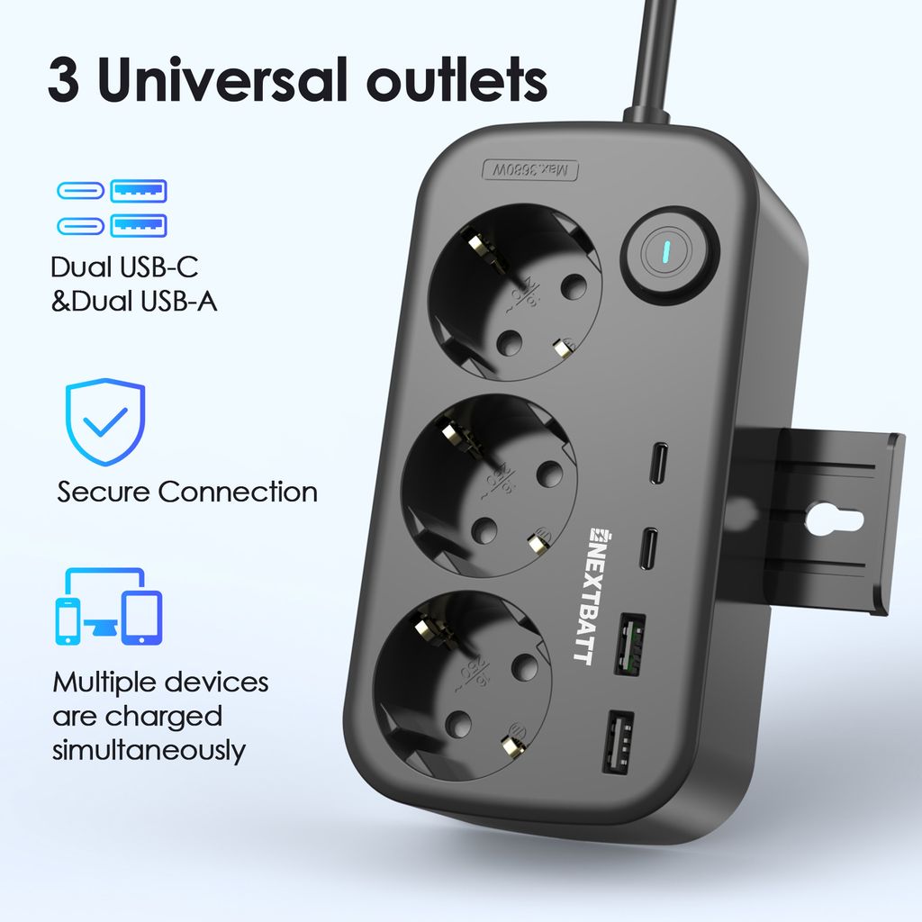 NEXTBATT stikdåse giver strøm til alle dine enheder på ét sted. Med tre jordede stikkontakter, to USB-C-porte og to USB-A-porte kan du oplade mobil, laptop, tablet, høretelefoner og mere samtidig - perfekt til skrivebordet, gaminghjørnet eller natbordet.