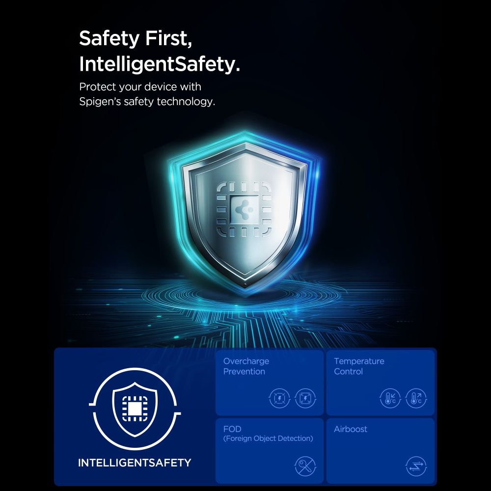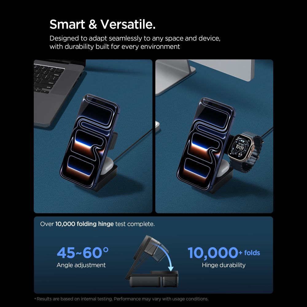 Gør opladningen nemmere og mere stilfuld med Spigen Essential Qi2.2 3-i-1 trådløs ladestation! Oplad mobil, smartwatch og trådløse høretelefoner samtidig - helt uden kabelrod. Med Qi2.2 og op til 25W effekt får du hurtig og stabil opladning, mens de stærke magneter holder din MagSafe-kompatible mobil perfekt på plads.
