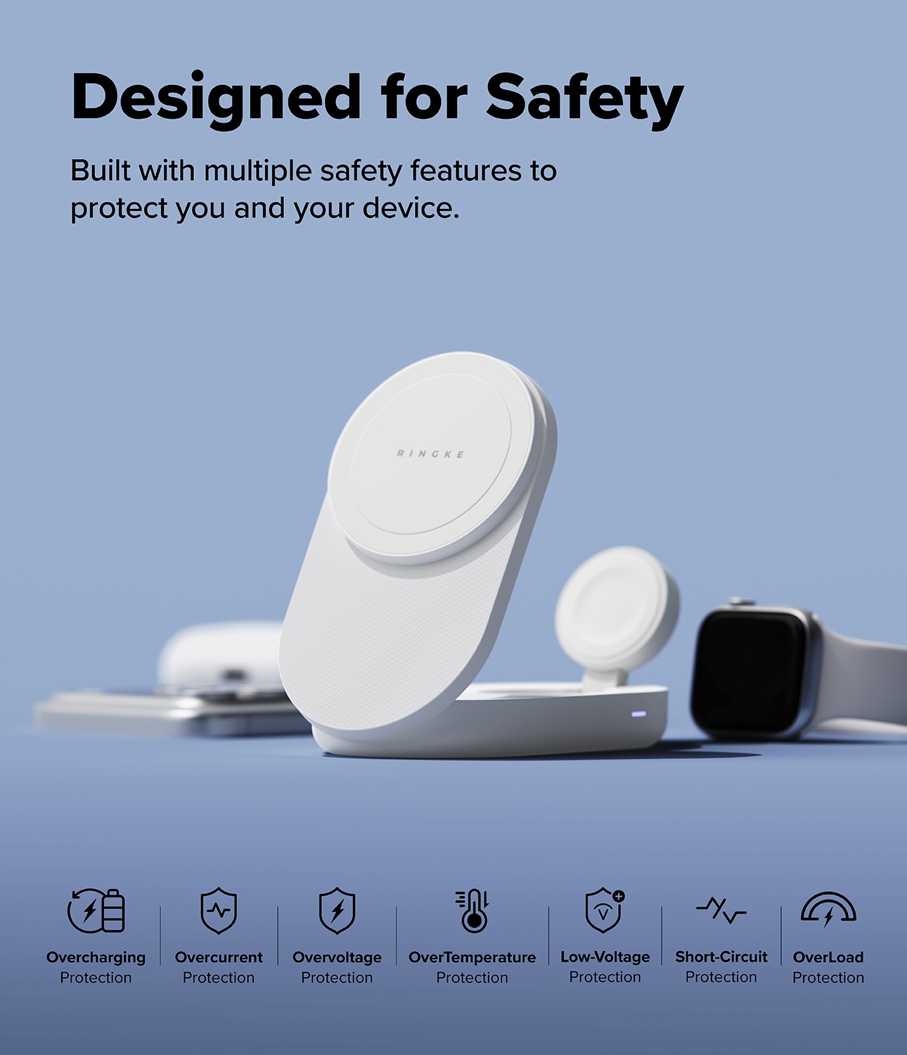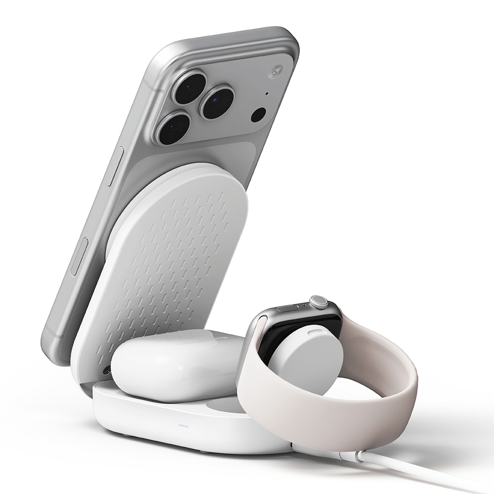 Træt af ledninger, der roder og snor sig? Så er Ringke Qi2 3-in-1 Magnetic Wireless Charging Folding Stand lige sagen! Her kan du oplade mobil, høretelefoner og Apple Watch på samme tid - trådløst, ryddeligt og helt uden kabelkaos. Perfekt til skrivebordet, natbordet eller tasken.