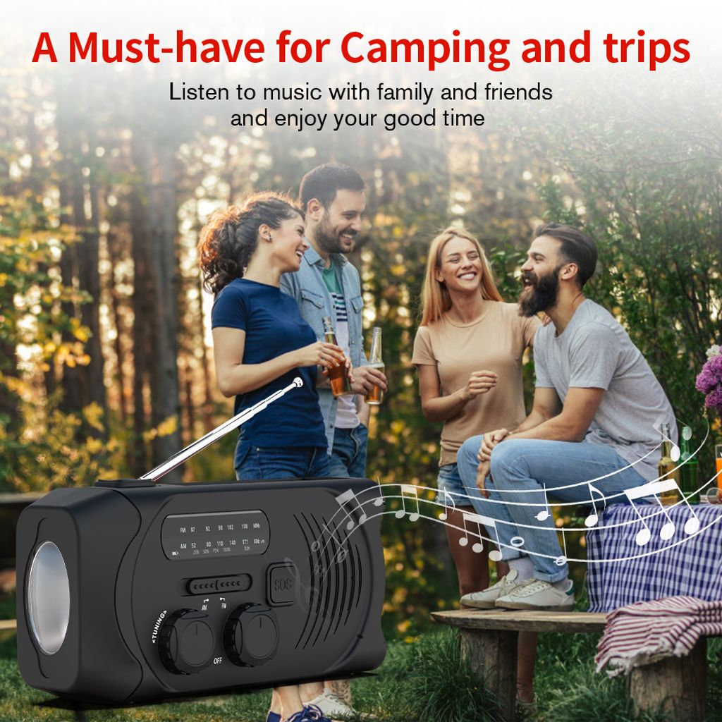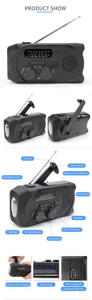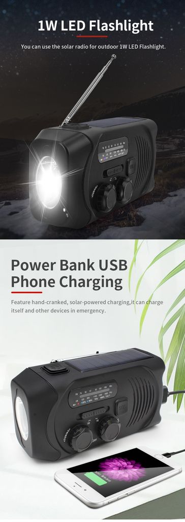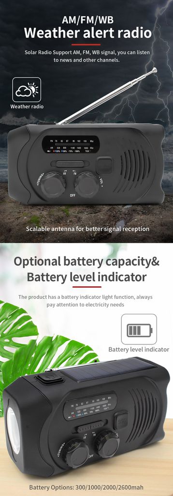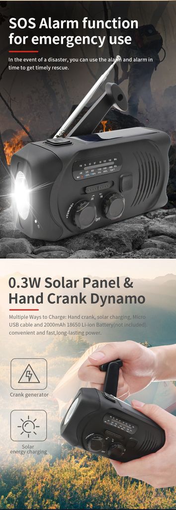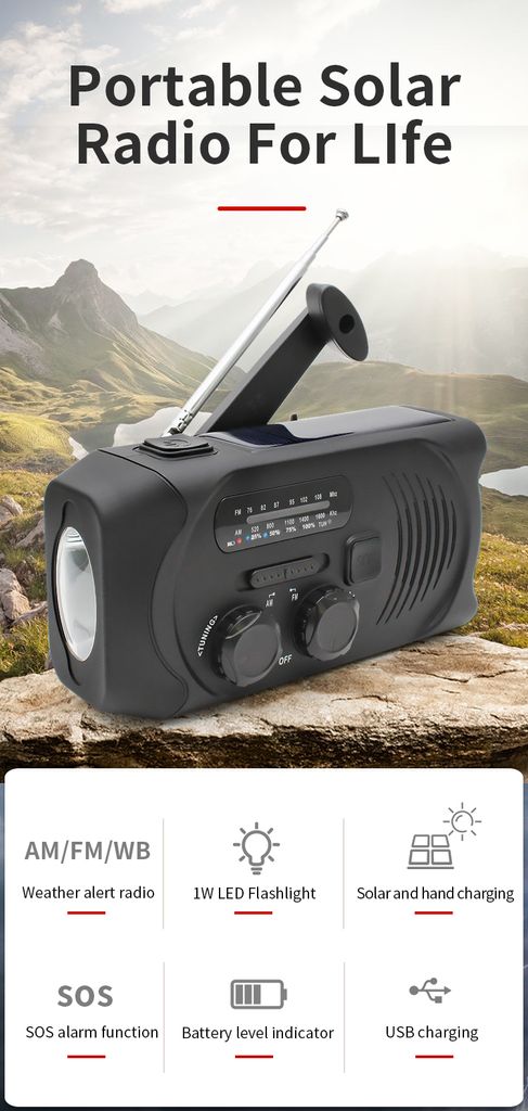 - Type: Dynamoradio / håndsvingradio med solceller, lommelygte og nødlader