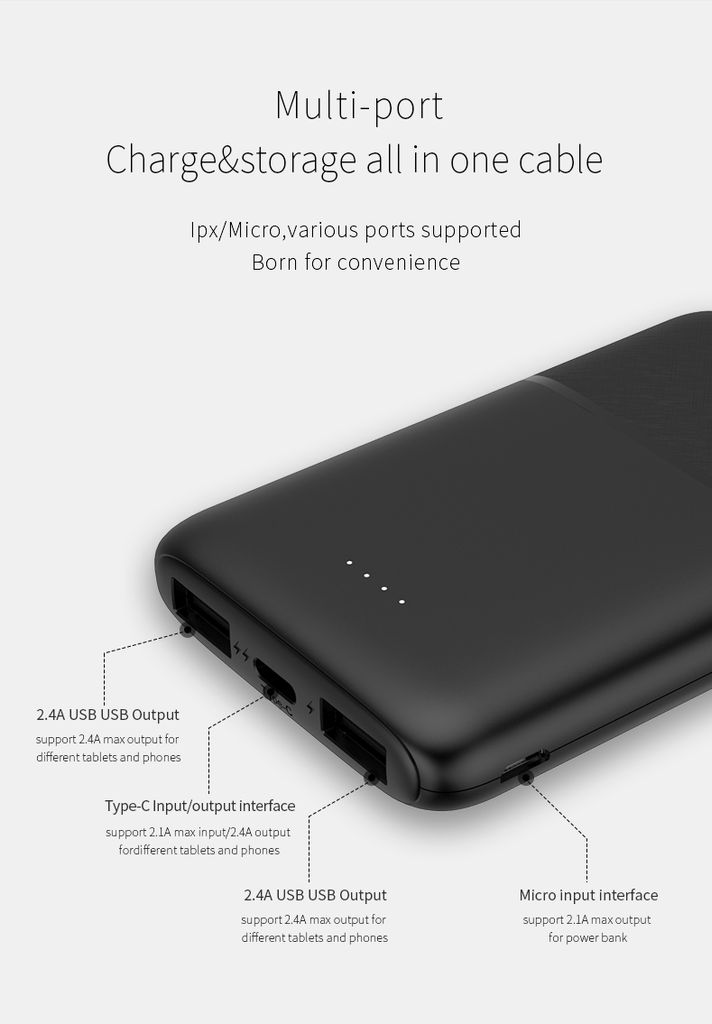 Powerbanken har én USB-C-udgang og to USB-A-udgange, så du kan oplade flere enheder samtidig. USB-C-porten bruges også til opladning af powerbanken. LED-indikatoren viser batteristatus tydeligt.