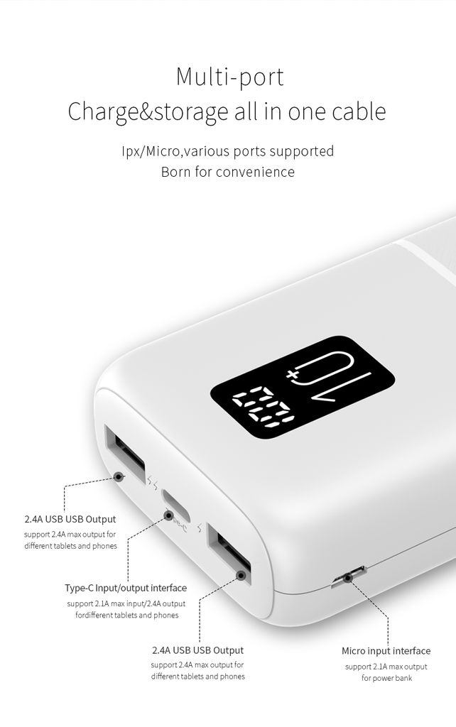 LED-displayet viser batteriniveauet tydeligt. Med flere porte kan du oplade flere enheder. Hurtigopladning sikrer effektiv opladning.