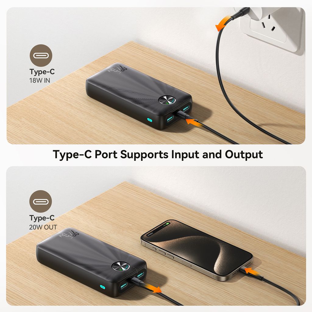 Det tydelige LED-display viser præcist, hvor meget strøm der er tilbage, så du altid har fuld kontrol over batteriniveauet. Med én USB-C-port og to USB-A-porte kan du oplade flere enheder samtidig. Den kompakte størrelse gør powerbanken nem at have med i tasken eller lommen, så du altid har ekstra strøm klar, når du har brug for det.
