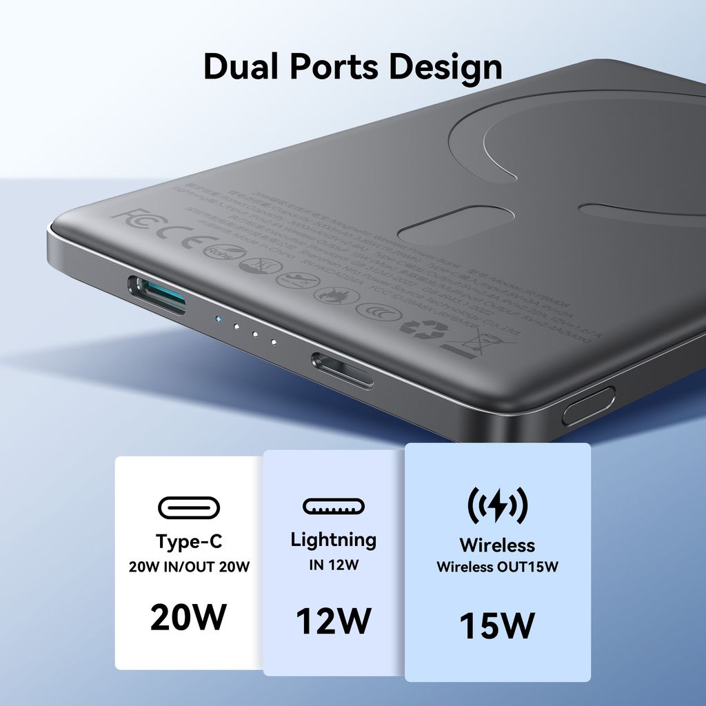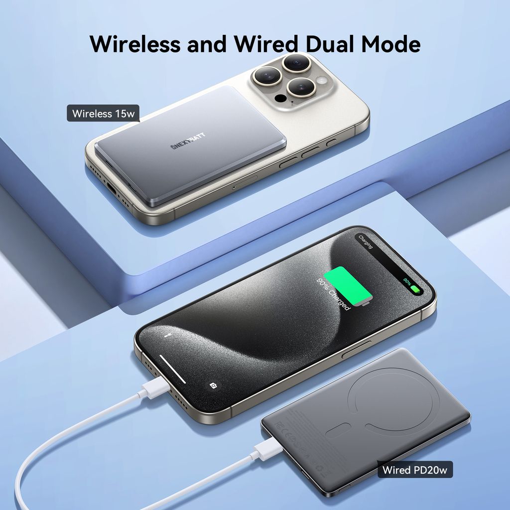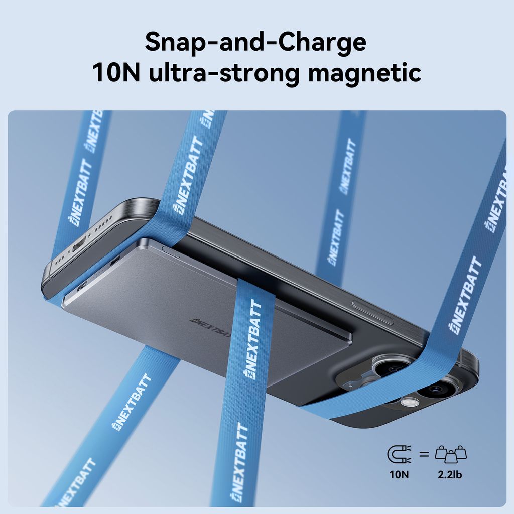 Hold dine enheder opladet med NEXTBATT magnetisk trådløs powerbank 5000mAh 20W. Det ultratynde design gør den nem at holde og have med på farten. Den stærke magnetiske fastgørelse på 10 N holder telefonen sikkert på plads og giver stabil trådløs opladning. Med op til 15W trådløs opladning og PD 20W hurtigopladning via USB-C får du hurtig og effektiv opladning. LED-indikatoren viser tydeligt batteriniveauet. Den kan oplade flere enheder, og lavstrømstilstand er perfekt til høretelefoner og smartwatches. Fremstillet af brandsikkert PC og ABS-materiale.