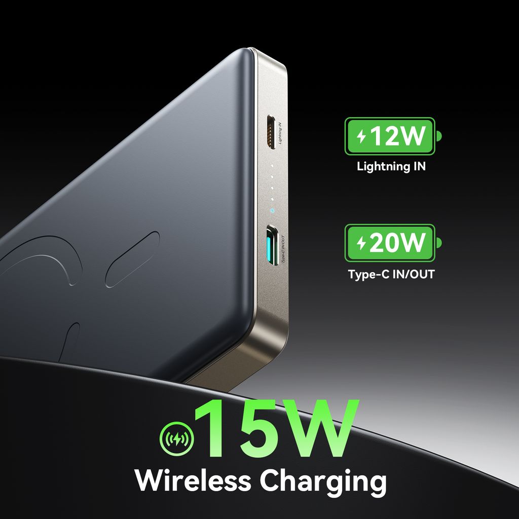 Med trådløs opladning op til 15W og hurtigopladning op til 20W via USB-C får du hurtig og effektiv opladning. Lavenergitilstanden sikrer stabil opladning af mindre enheder. Aluminiumdesignet giver en premiumfølelse og høj holdbarhed.
