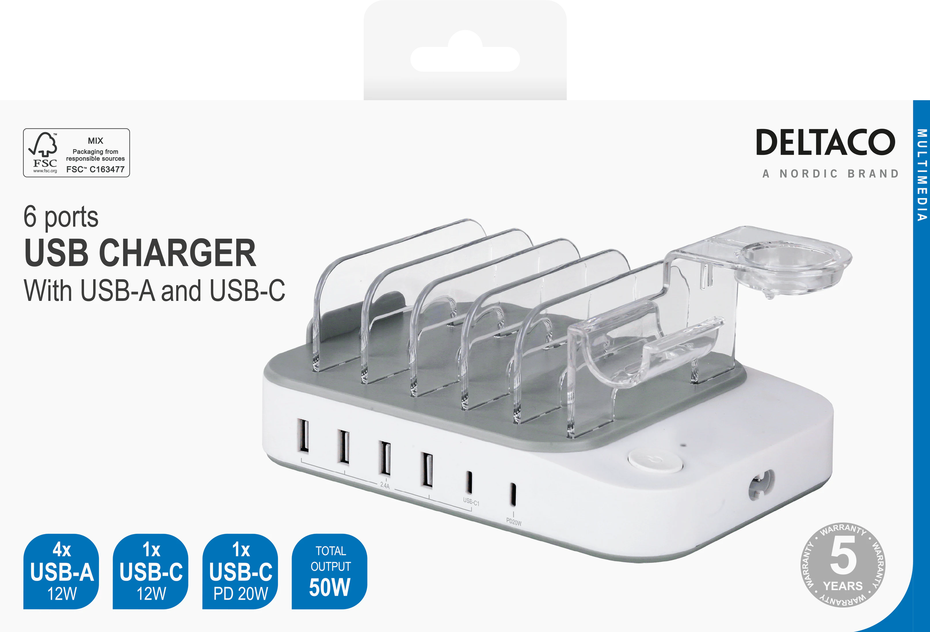 Kabelrod, fyldte stikkontakter og evig kamp om opladeren. Lyder det bekendt. Denne USB-ladestation er redningen og kan oplade op til seks enheder samtidigt uden stress. Mobiler, tablets, høretelefoner og smartwatches deler plads uden drama takket være fire USB-A-porte og to USB-C-porte. Med op til 50 W samlet effekt får alle dine gadgets den strøm, de har brug for.