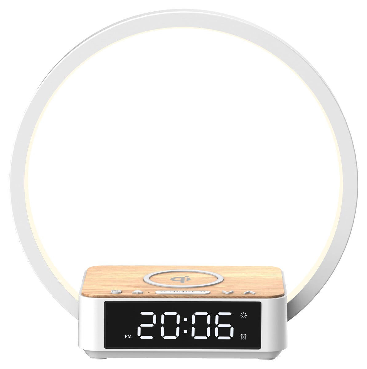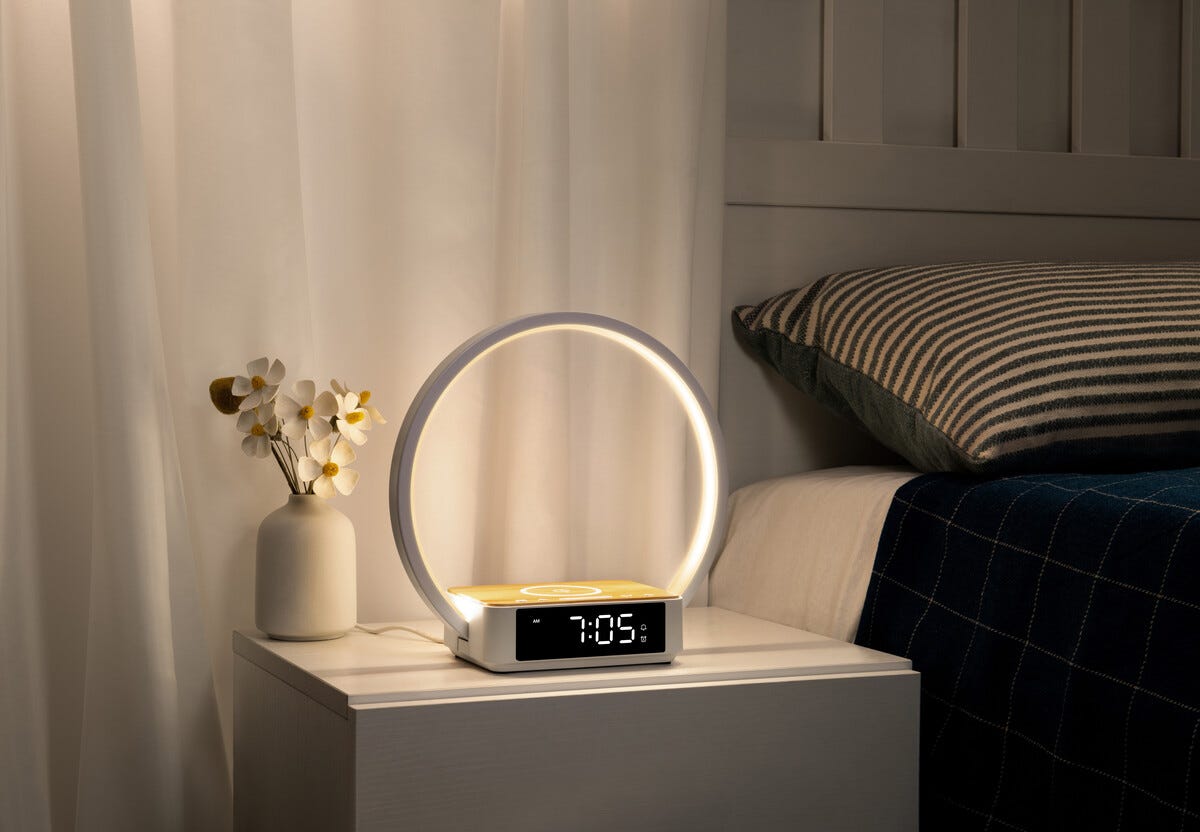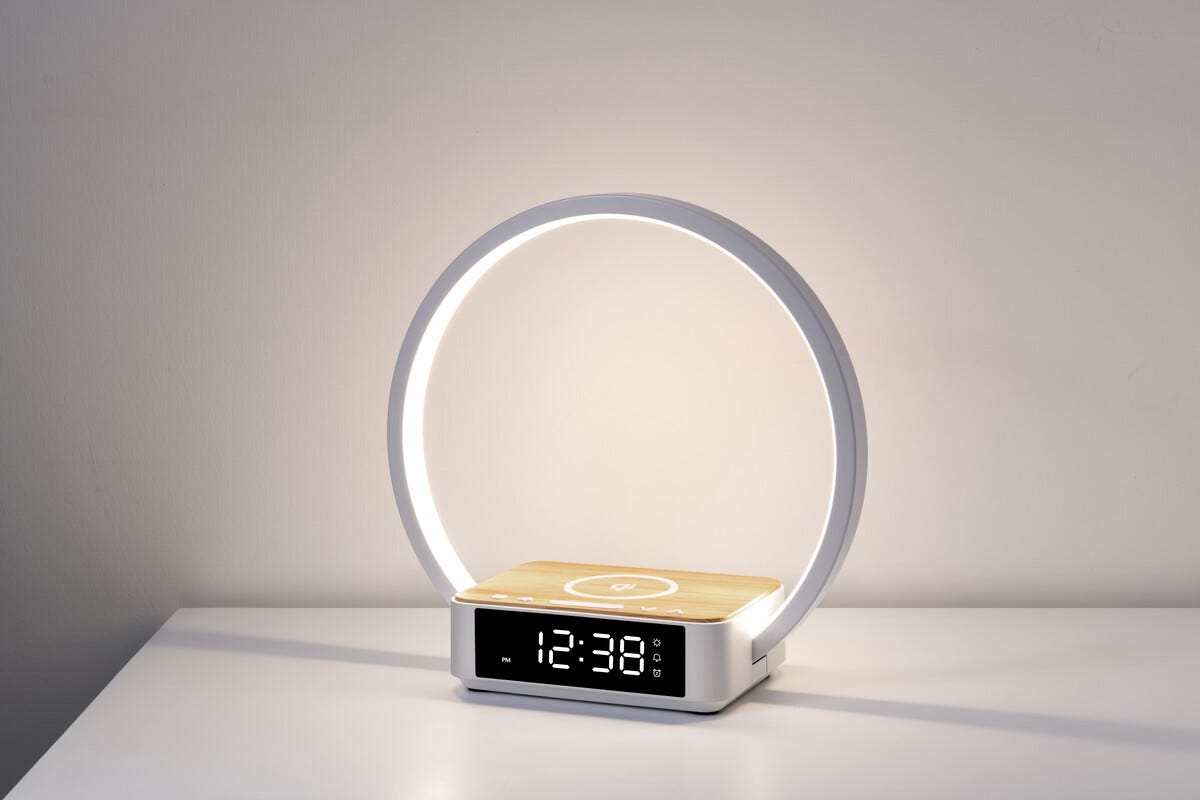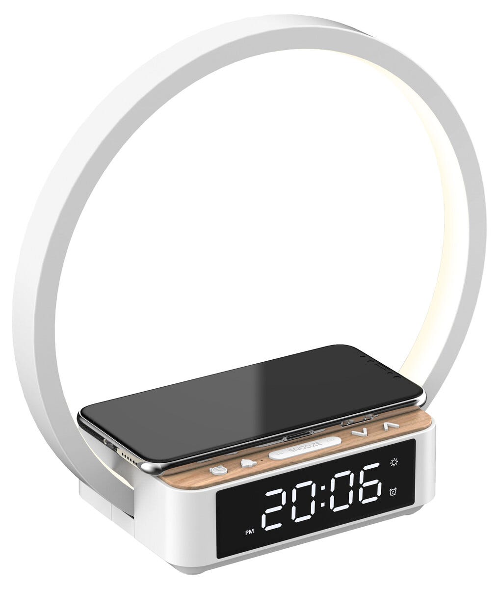 Vågn mere roligt og få en behagelig start på dagen med et digitalt vækkeur med Wake-Up Light og trådløs Qi-opladning. LED-lysringen øger gradvist lysstyrken før alarmen aktiveres og hjælper kroppen med at vågne mere naturligt, samtidig med at din mobil eller dine høretelefoner oplades trådløst direkte på toppen. Den tydelige og dæmpbare LCD-skærm gør det nemt at aflæse tiden både dag og nat, og flere lysindstillinger giver mulighed for at tilpasse belysningen efter behov og stemning. Backupbatteriet sikrer, at tiden gemmes ved strømafbrydelse, så du altid vågner til tiden.