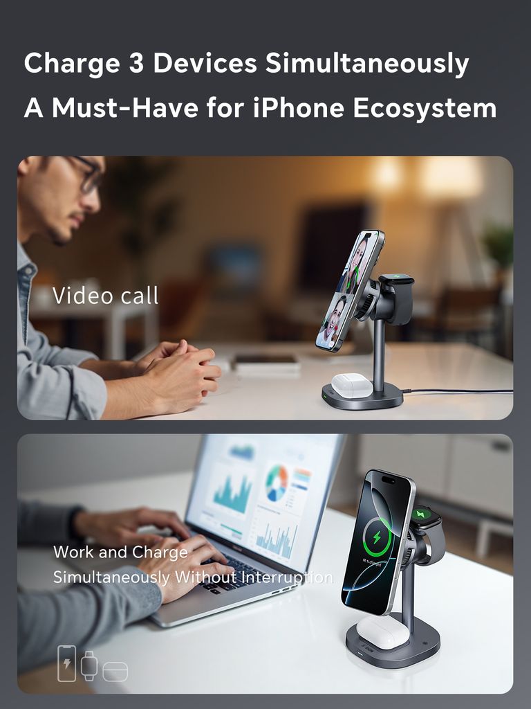 - Oplad mobil, høretelefoner og Apple Watch samtidig