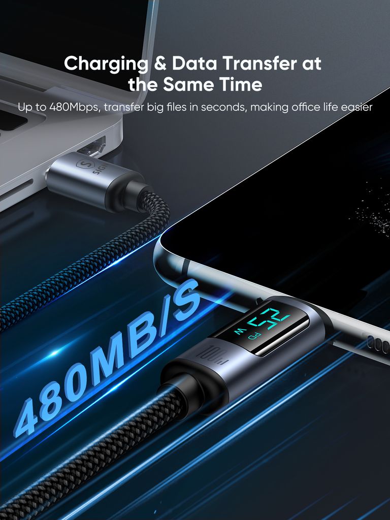 Det indbyggede display viser opladningseffekten i realtid, så du altid har overblik. Kablet understøtter dataoverførsel op til 480 Mbps, perfekt til hurtig overførsel af filer. Den robuste konstruktion sikrer lang levetid.