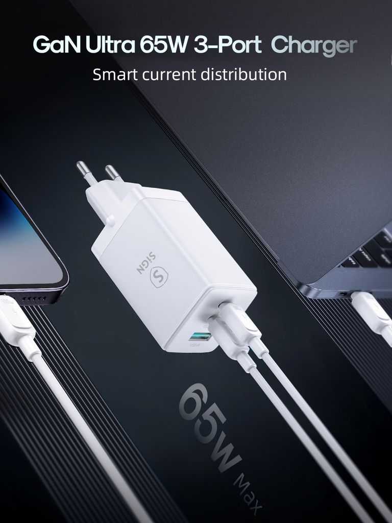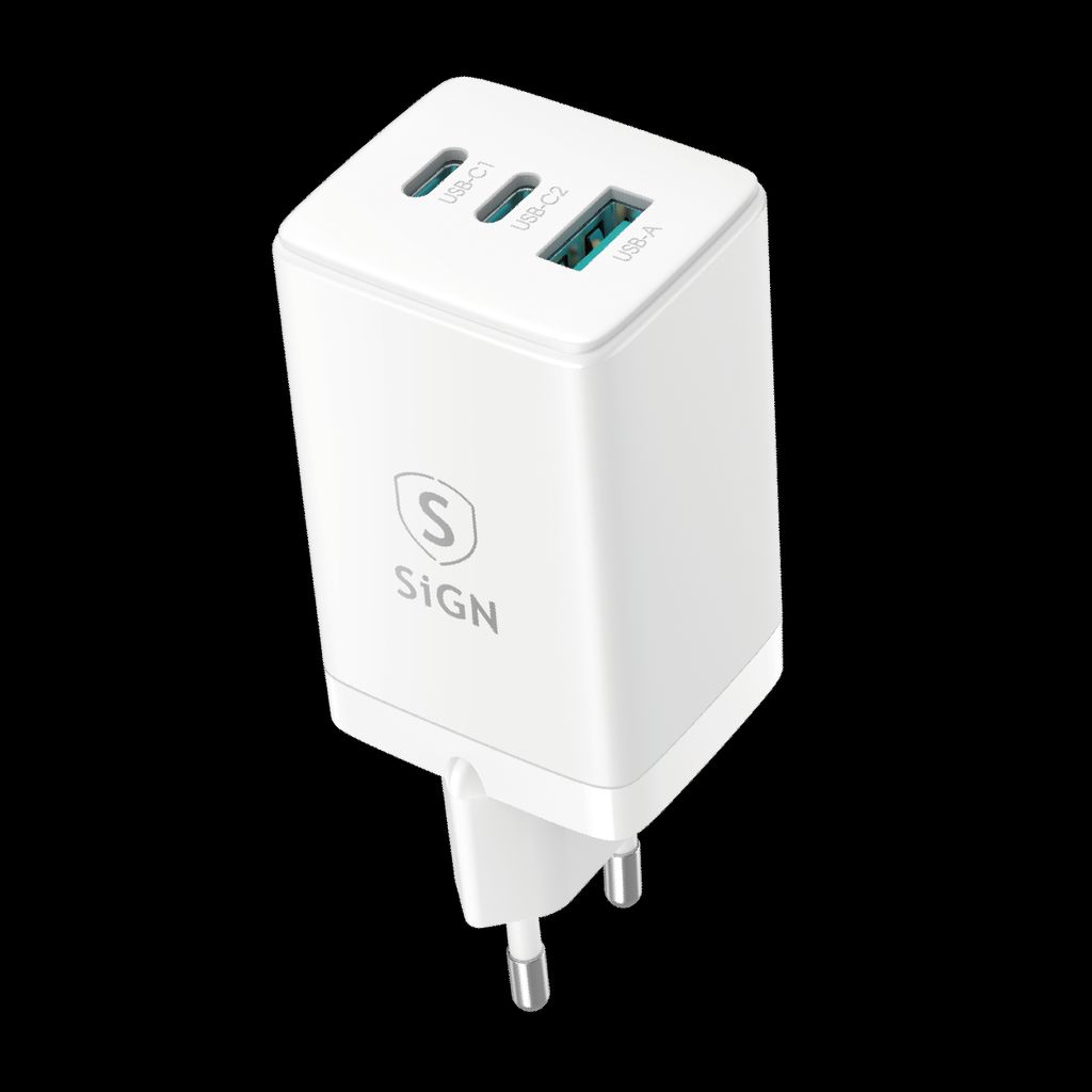 Få fuld fart på opladningen med SiGN GaN 65W hurtigoplader. Den leverer masser af kraft i et kompakt format og lader dig oplade laptop, mobil og tablet samtidigt uden besvær. To USB-C-porte og én USB-A-port giver maksimal fleksibilitet.