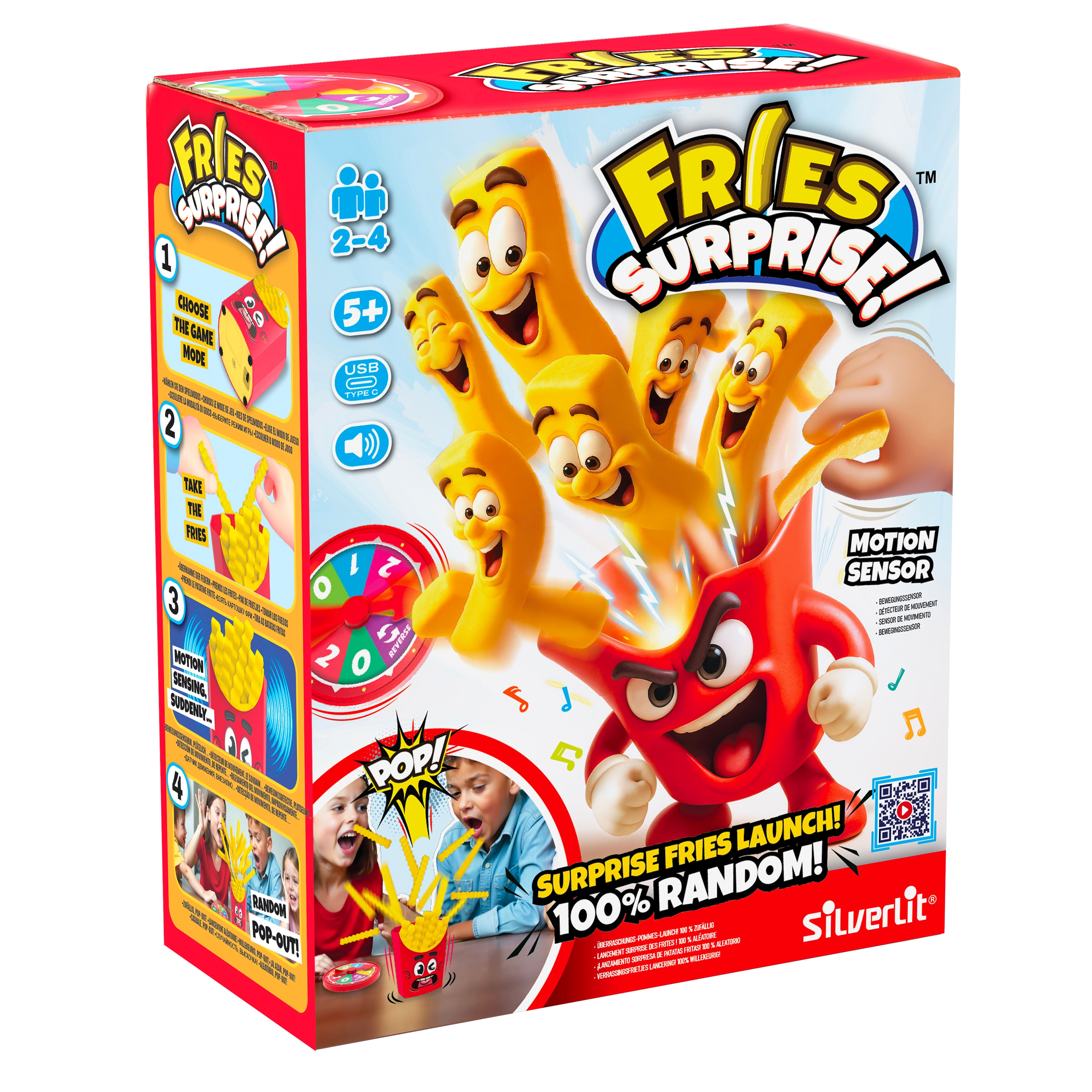 Fries Surprise oplades med det indbyggede genopladelige batteri via USB-C og er hurtigt klar til næste runde med sjov og uventede eksplosioner.
