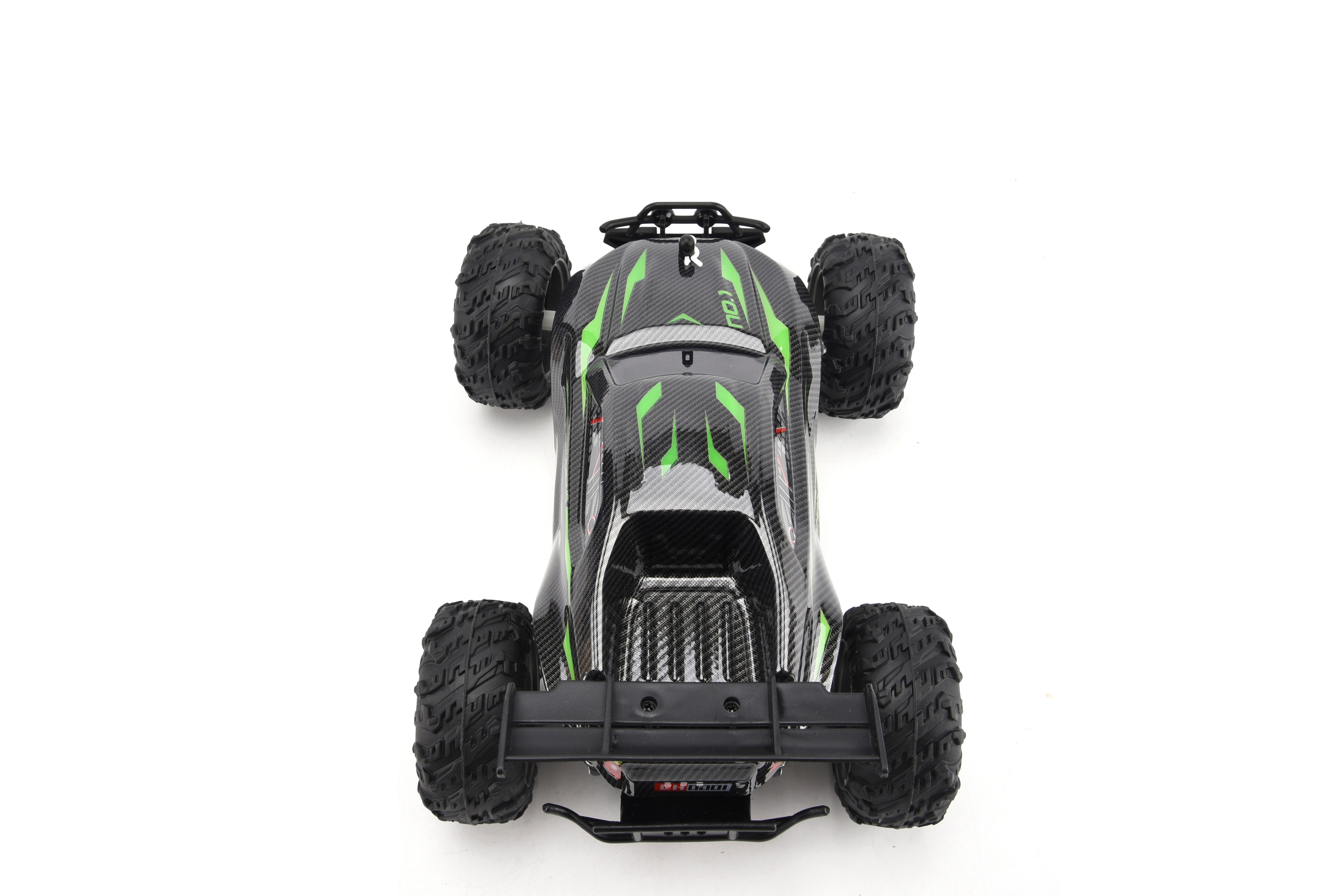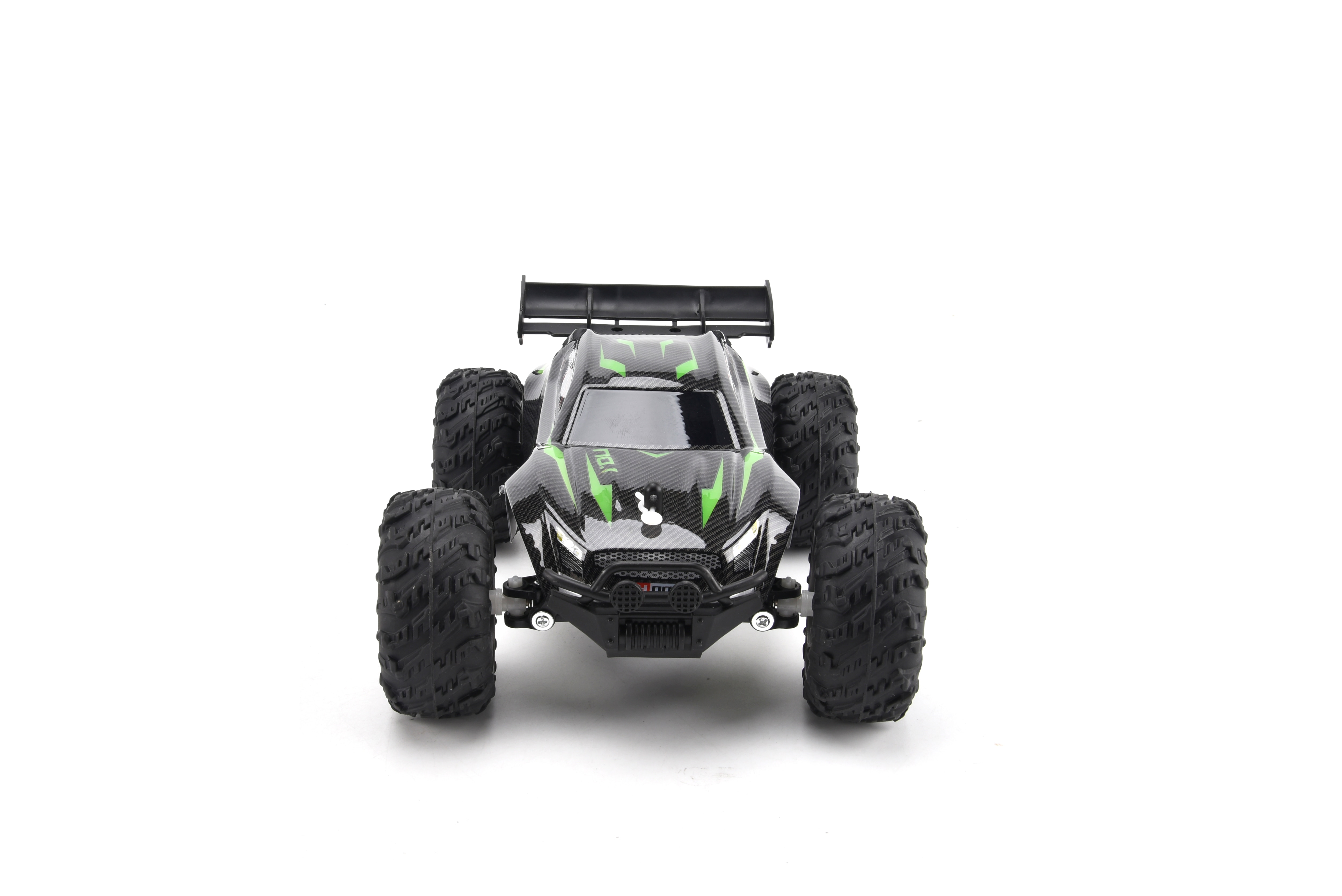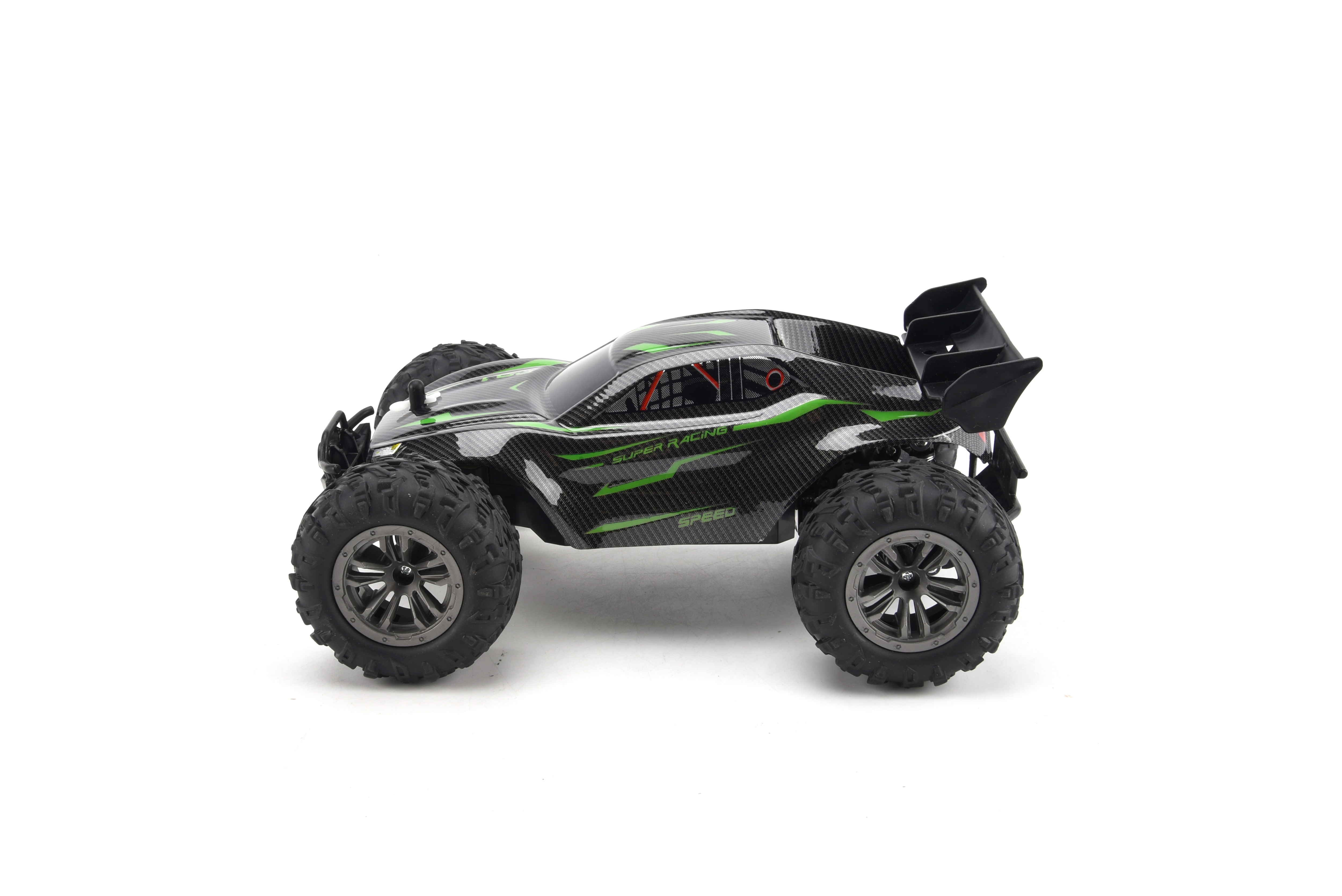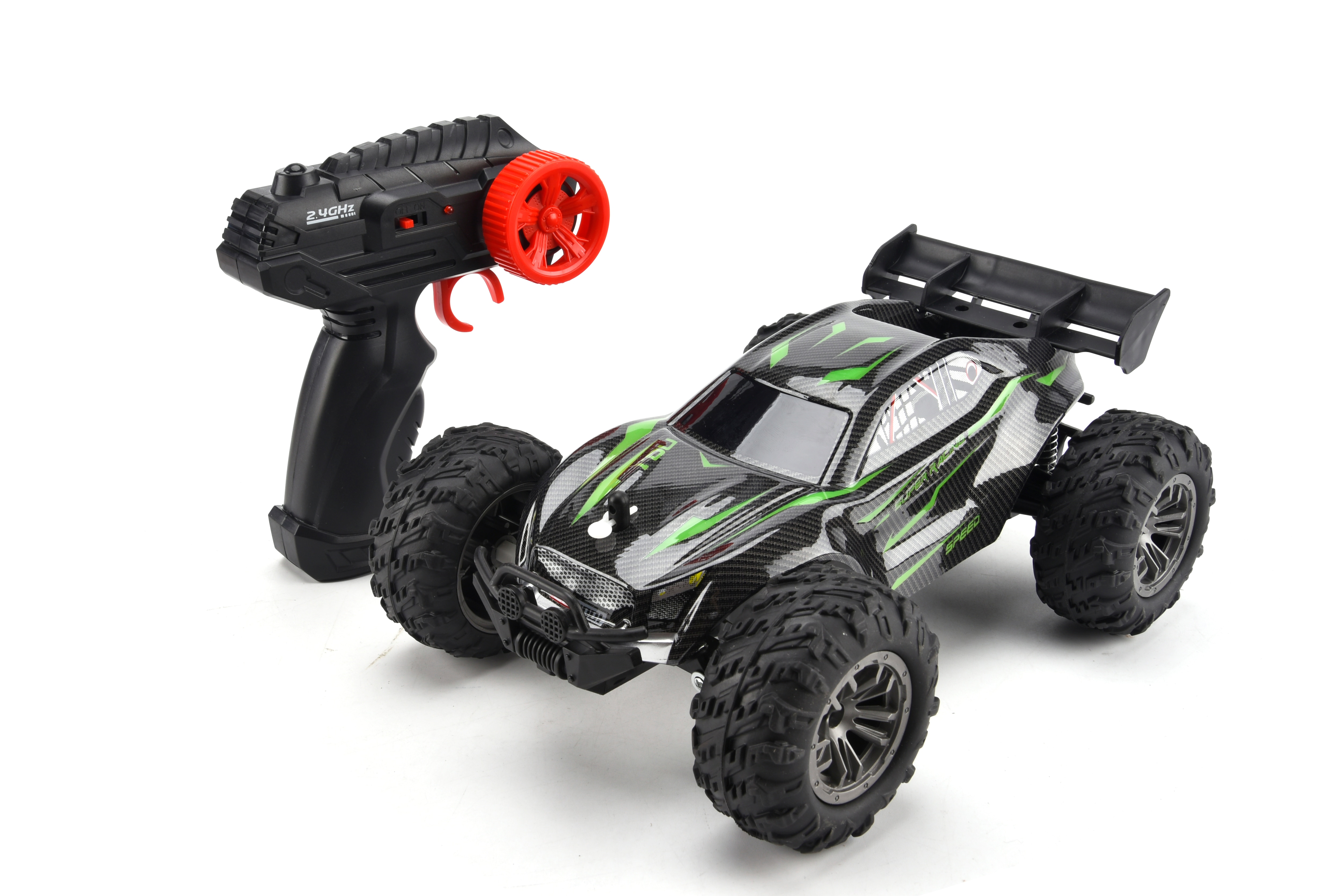 Den kraftige motor, de store dæk og støddæmperne giver stabil kørsel og godt greb, selv når det går stærkt. Takket være 2,4 GHz-frekvensen kan flere radiostyrede biler køre samtidig uden forstyrrelser.