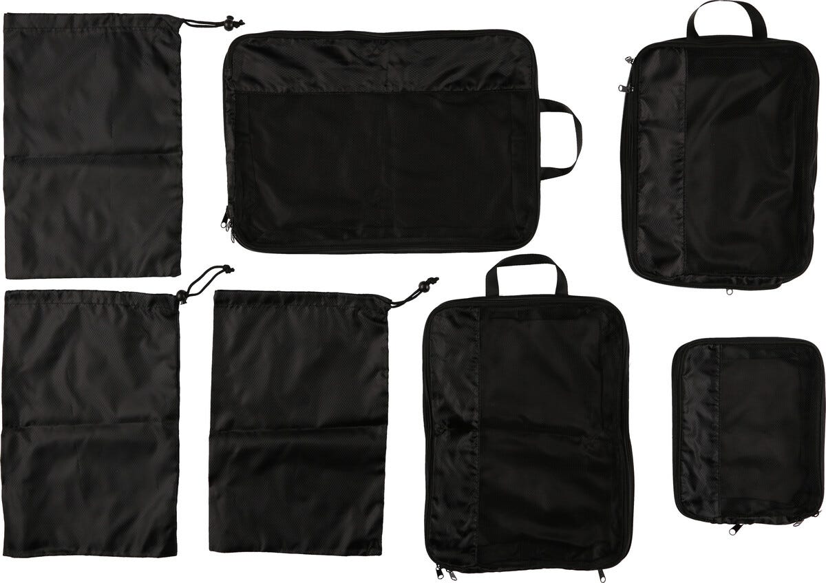 Pak som en pro og få styr på kufferten med smarte pakkekuber, der gør rejsen nemmere - slut med at rode rundt efter tøj. Med 7 dele kan du nemt opdele tøj, sko og tilbehør, så alt ligger organiseret og klar til brug. De komprimerbare lynlåse hjælper med at spare plads og holde det hele pænt under hele turen.