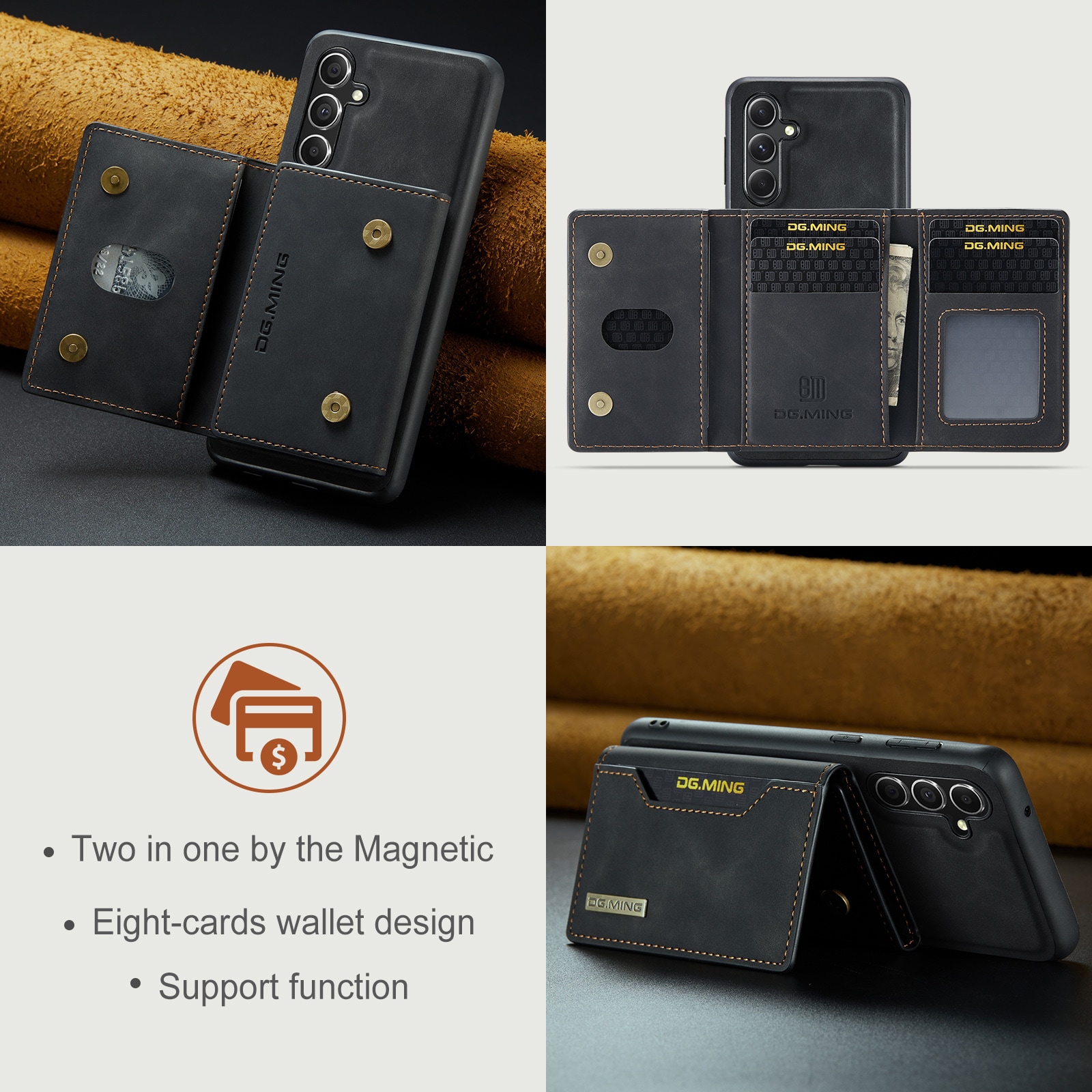 - Dobbeltfunktion som både pung og stativ