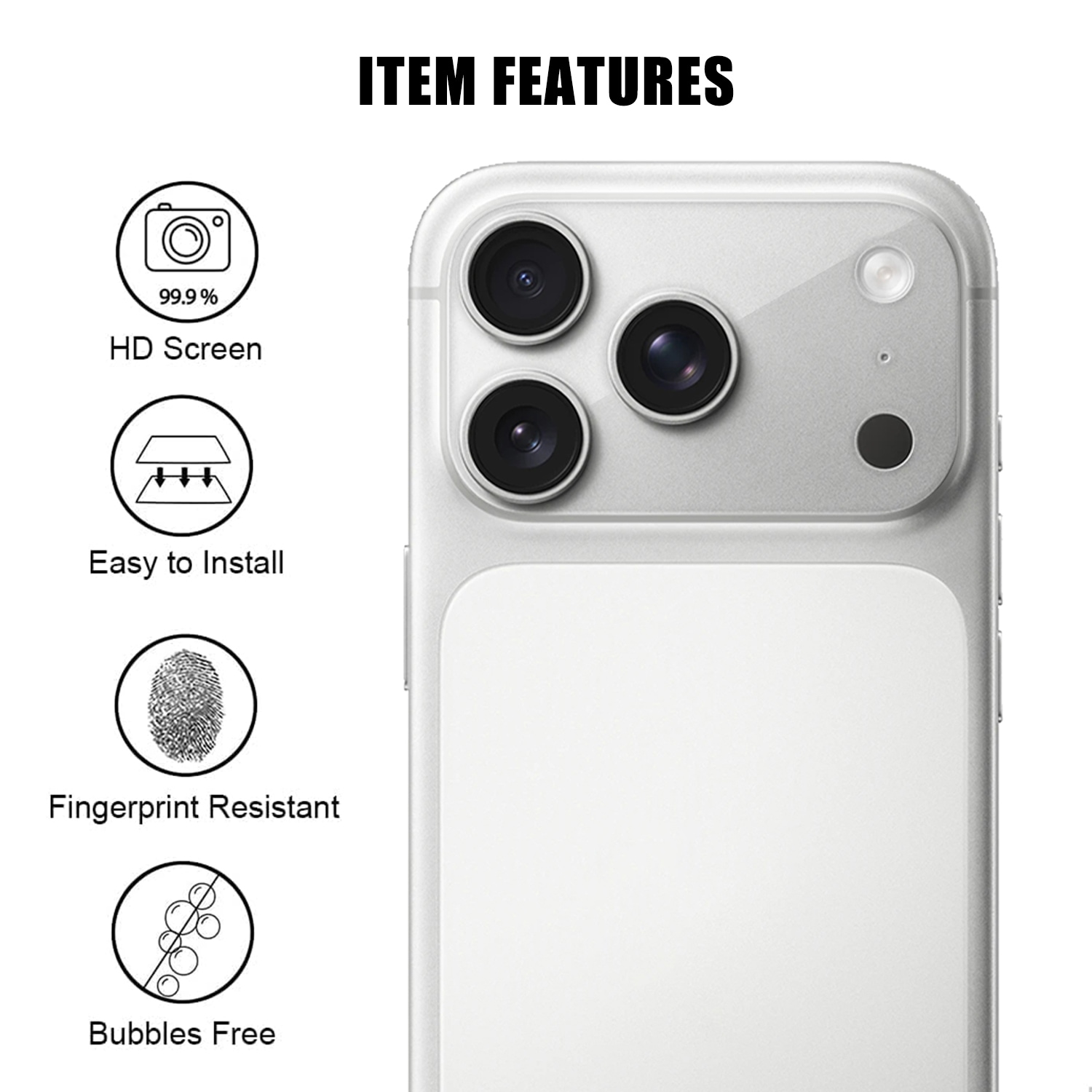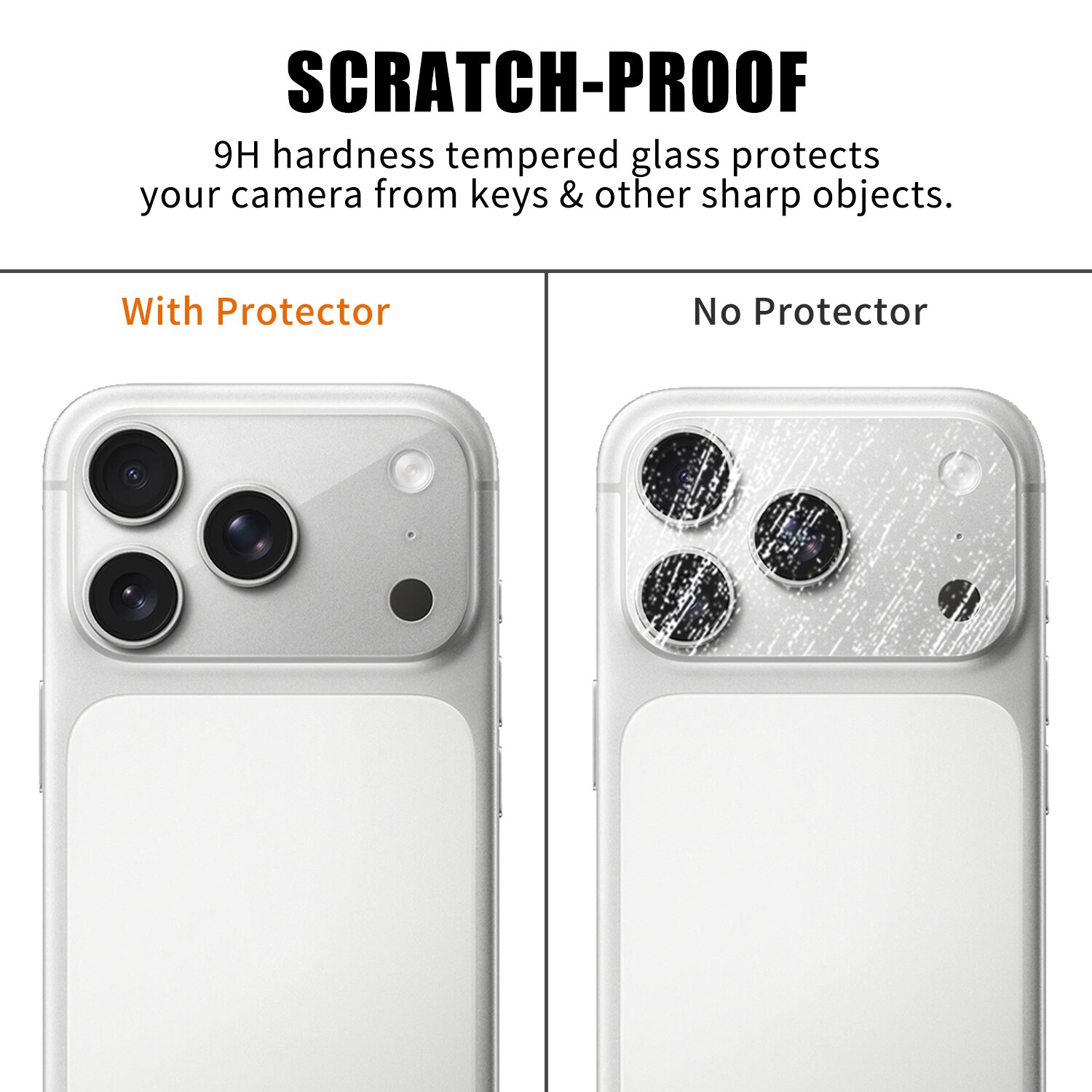 Kameralinsebeskytter i hærdet glas til Apple iPhone 17 Pro Max, som hjælper dit kamera med at holde sig pænt og klar til action. Beskytter effektivt mod ridser, stød og daglig slitage. Den fulddækkende beskyttelse omslutter både linser og kamerahus, og når den først er monteret, er den næsten usynlig.