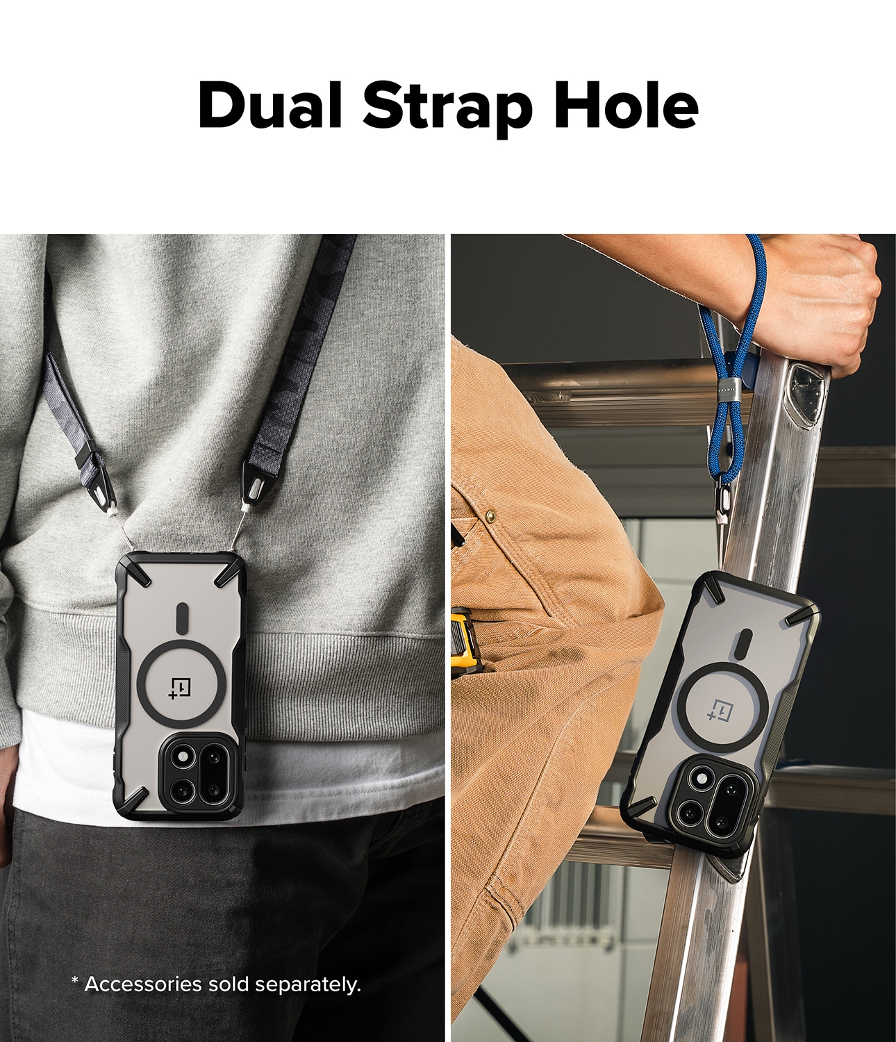 - Coveret har små smarte huller til at fastgøre en halsrem eller håndledsrem for ekstra sikkerhed og stil