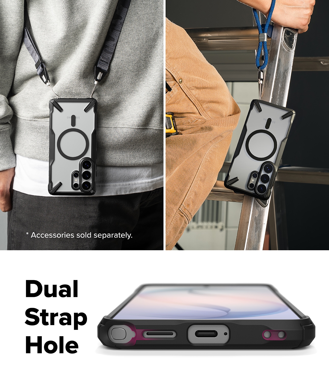 - Coveret har små smarte huller til at fastgøre en halsrem eller håndledsrem for ekstra sikkerhed og stil