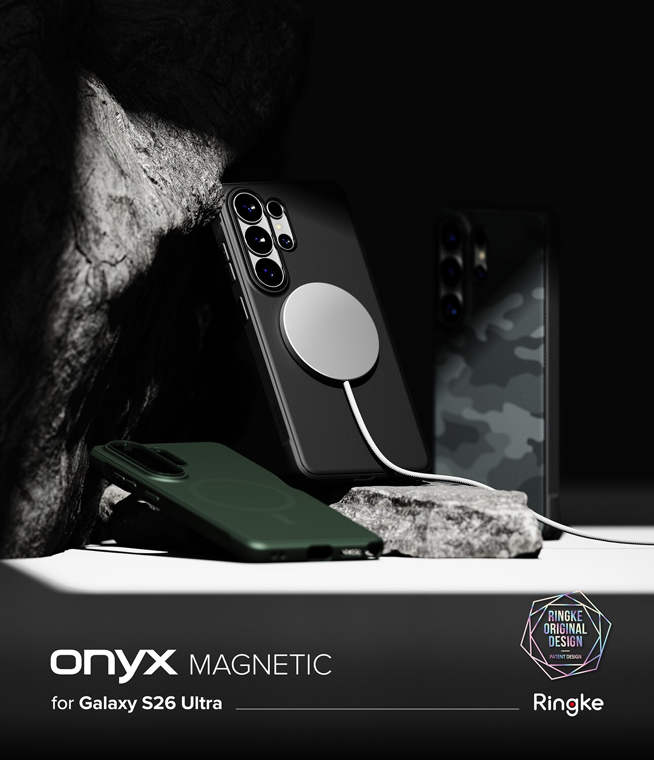 Dette er Onyx Magnetic Case - det seje og stilrene MagSafe-cover til Samsung Galaxy S26 Ultra fra Ringke. Det er ikke bare et cover - det er en ridder i skinnende rustning med sit elegante udseende og fremragende stødabsorbering. Forestil dig forstærkede hjørner som et skjold, hævede kanter som en voldgrav og knapper så taktile, at de føles som et hemmeligt håndtryk. Den indbyggede magnetiske ring gør coveret fuldt MagSafe-kompatibelt med f.eks. opladere og kortholdere.