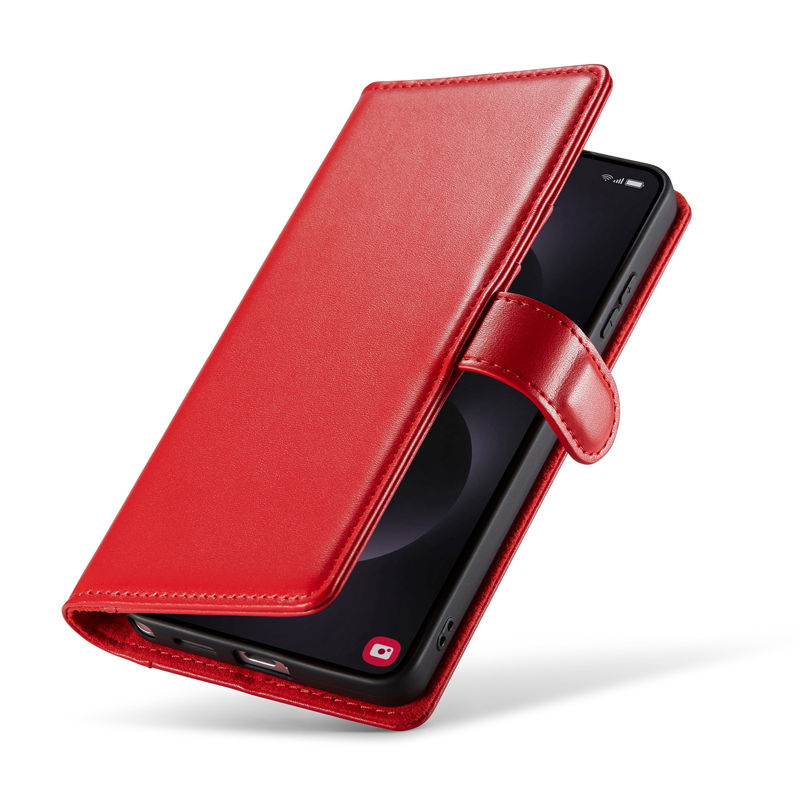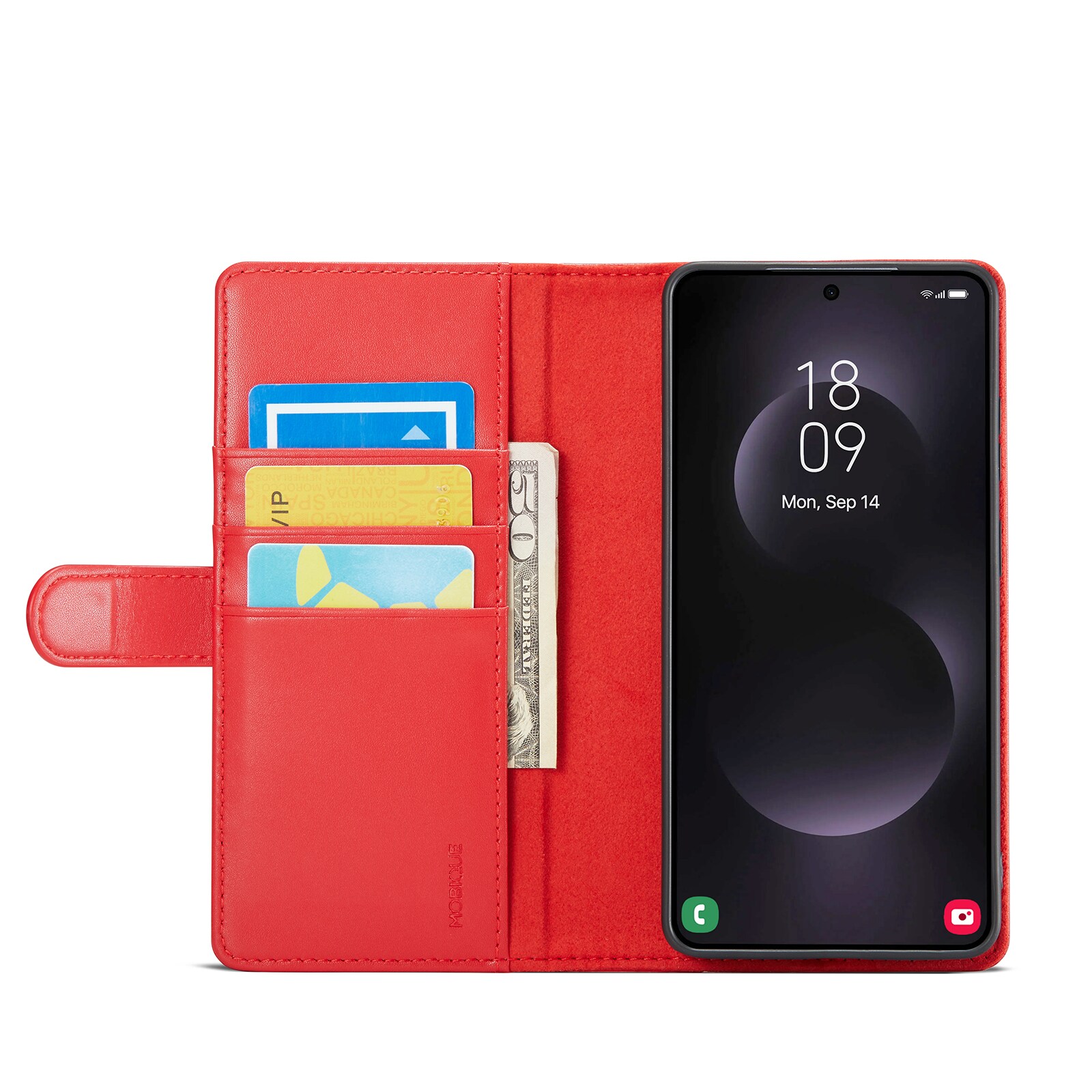 Din mobil sidder som støbt i det indbyggede, stødabsorberende TPU-cover. Klappen lukkes med en smart magnetlukning og beskytter både for- og bagside. Farvel til knuste skærme og ridser!