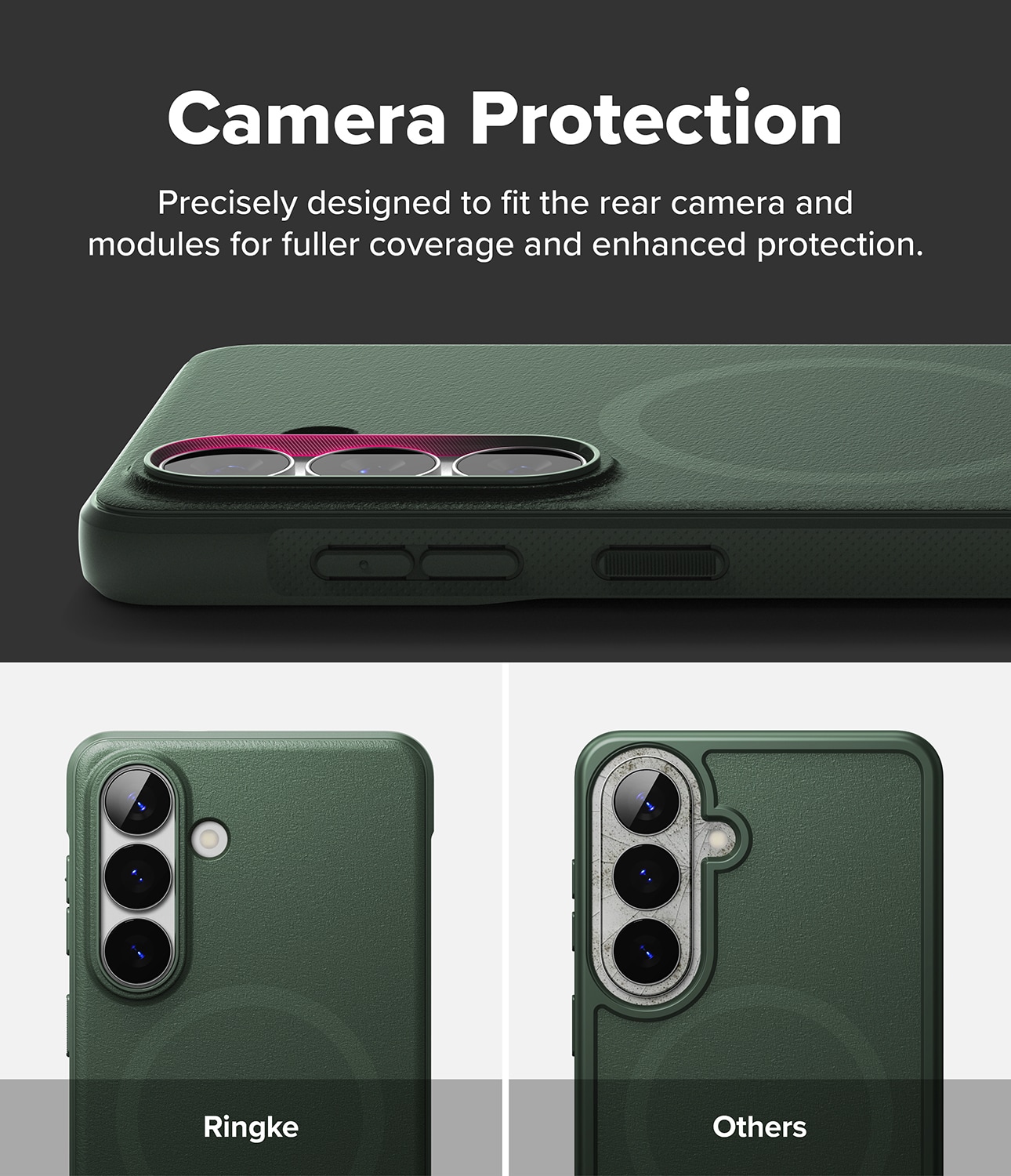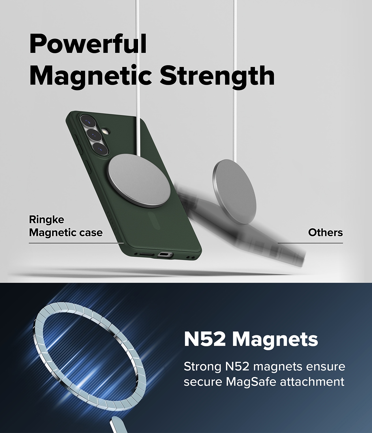 Dette er Onyx Magnetic Case - det seje og stilrene MagSafe-cover til Samsung Galaxy S26 fra Ringke. Det er ikke bare et cover - det er en ridder i skinnende rustning med sit elegante udseende og fremragende stødabsorbering. Forestil dig forstærkede hjørner som et skjold, hævede kanter som en voldgrav og knapper så taktile, at de føles som et hemmeligt håndtryk. Den indbyggede magnetiske ring gør coveret fuldt MagSafe-kompatibelt med f.eks. opladere og kortholdere.