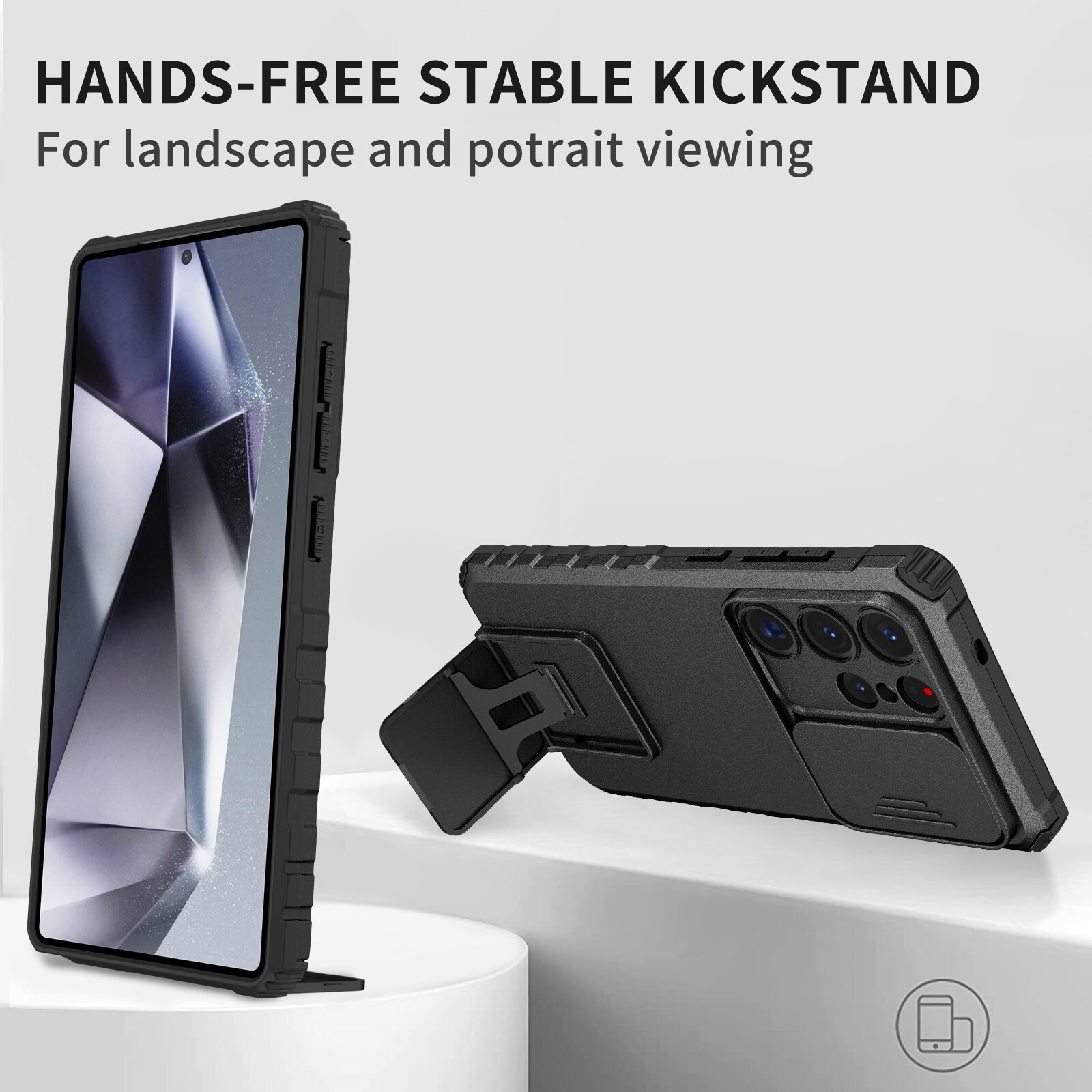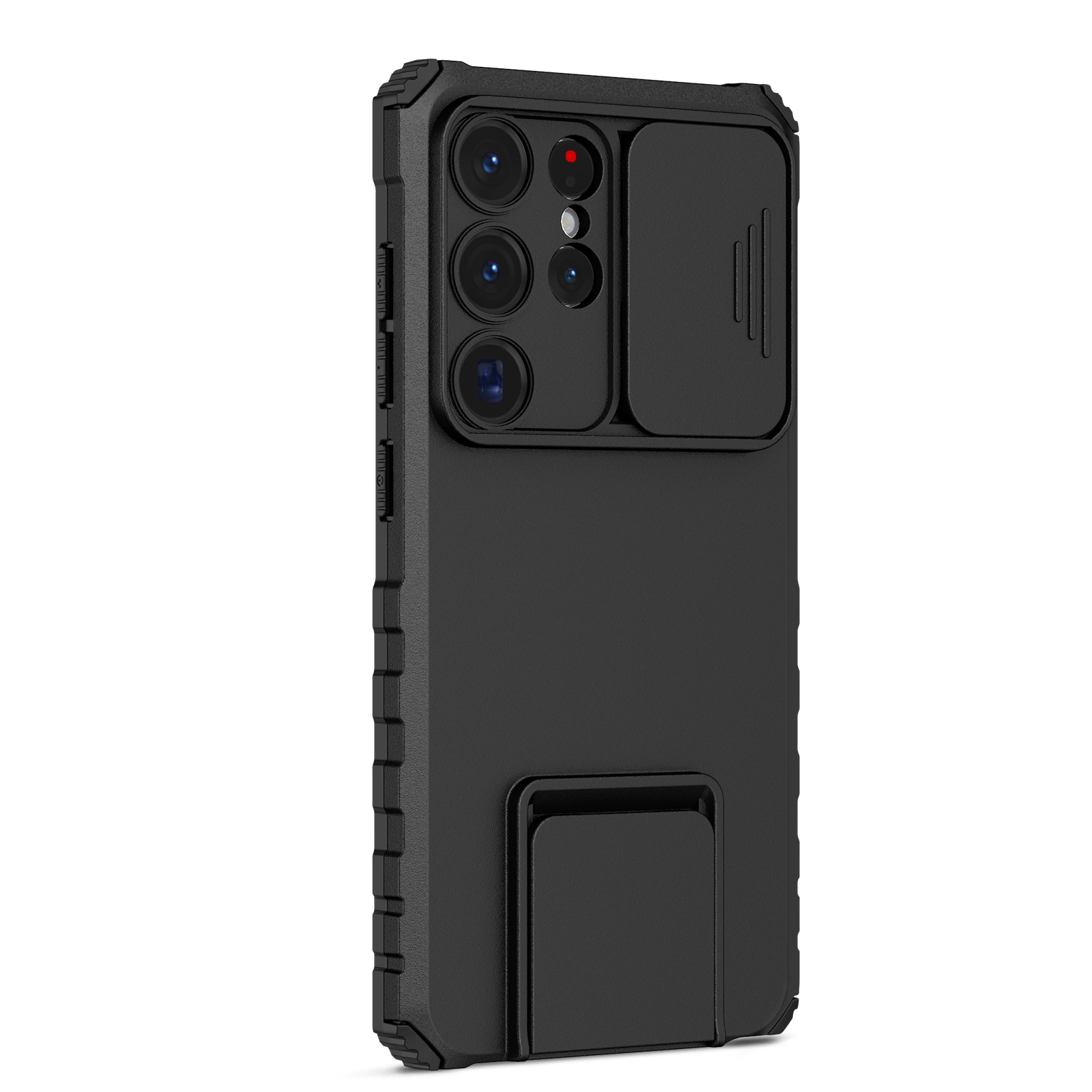 Ud over at tage imod stød som en mester, har det også en lille skydeklap, du kan trække hen over kameraet for at beskytte mod ridser, snavs og skader. Og det bedste? Et indbygget stativ, så du kan placere mobilen både lodret og vandret - perfekt til seriemaraton eller videosamtaler uden hænder.