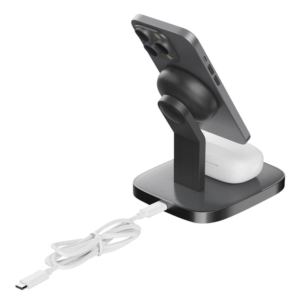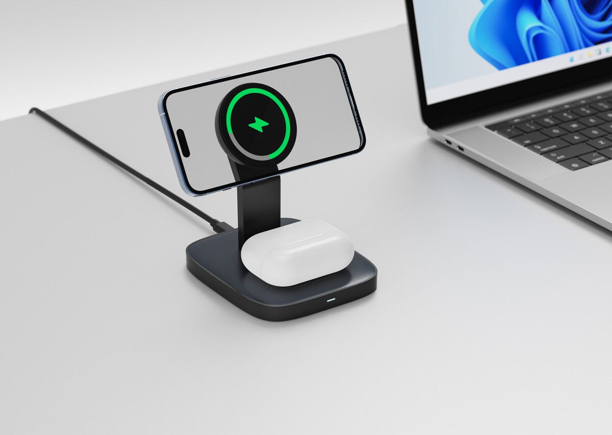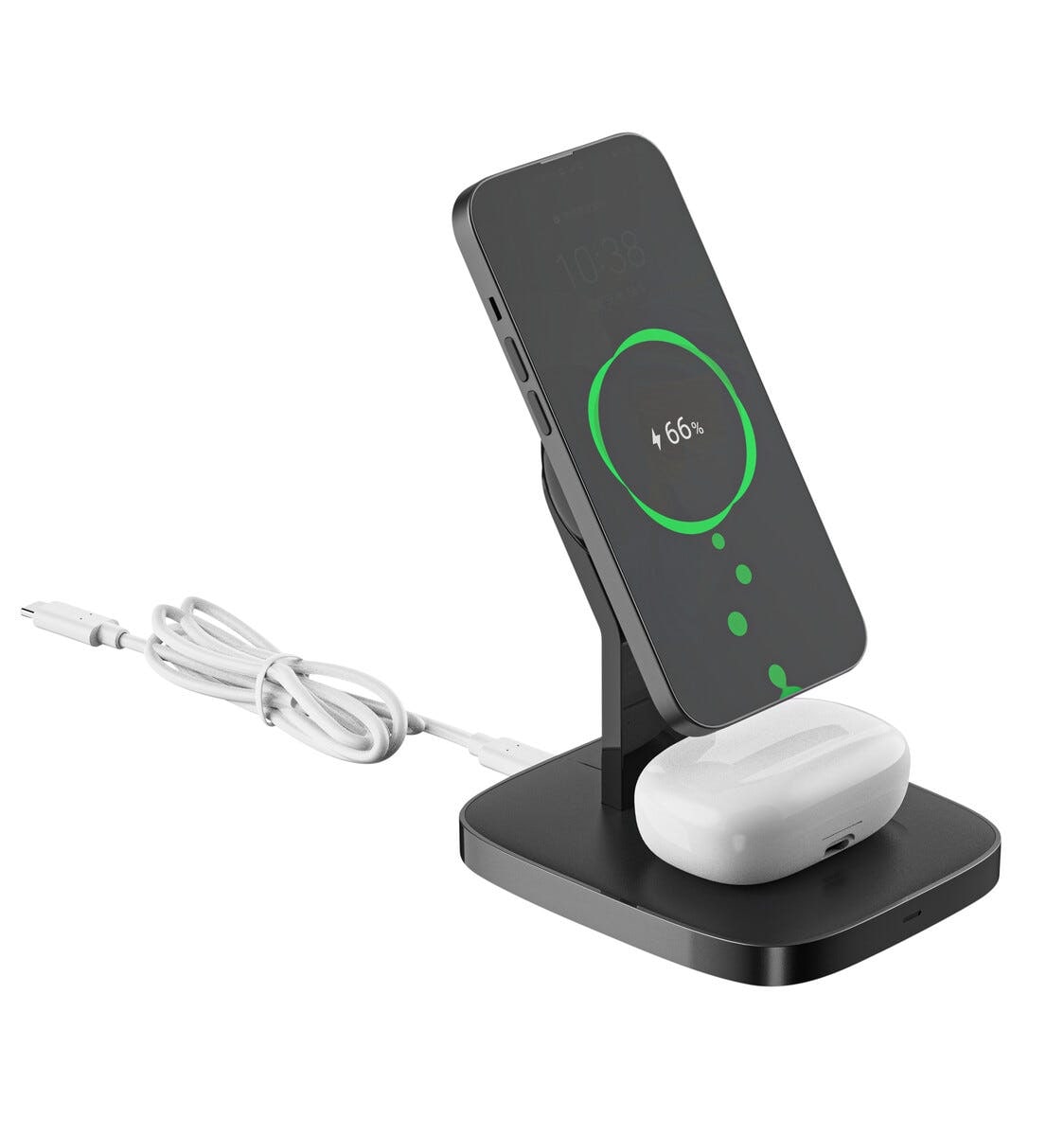 Gør opladningen nemmere og mere organiseret med en magnetisk trådløs Qi2 ladestation 2-i-1 som lader dig oplade mobilen og dine høretelefoner samtidig. Den smarte magnetiske konstruktion holder telefonen stabilt på plads mens Qi2-teknologien giver hurtig og effektiv opladning med op til 15 W effekt. Perfekt når du vil have mobilen i den rette vinkel til video, opkald eller arbejde samtidig med at den oplades. Den separate ladeplade gør det nemt at give AirPods eller andre trådløse TWS-høretelefoner ny energi uden kabelrod. Det stilrene og kompakte design gør ladestationen til et praktisk tilbehør på skrivebordet eller natbordet.