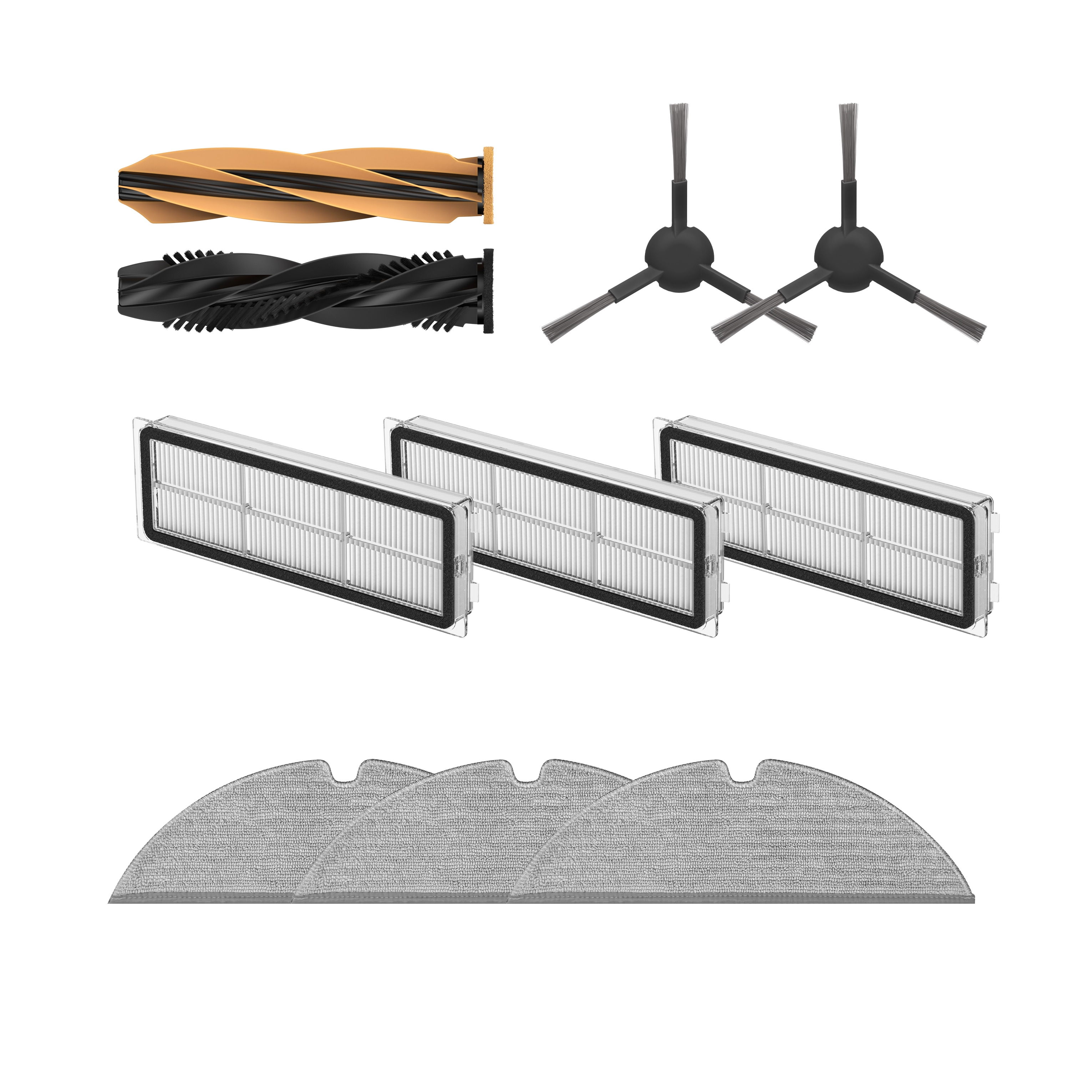 1 hovedbørste, 2 sidebørster, 3 filtre og 3 moppeklude